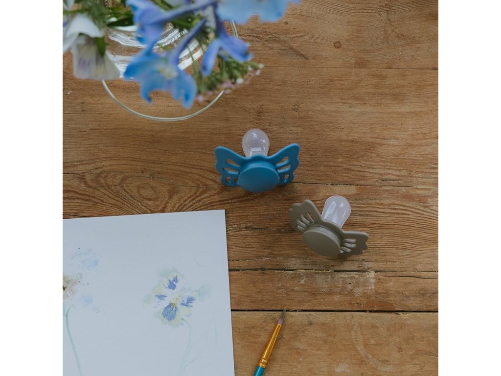 FRIGG Butterfly tvarom pripomína motýľa. Štít so zvlnenými okrajmi má veľké vzduchové otvory a v pristriedku nájdete okrúhly stred, ktorý zvýrazňuje eleganciu cumlíka.