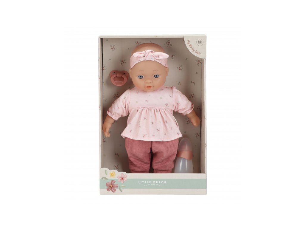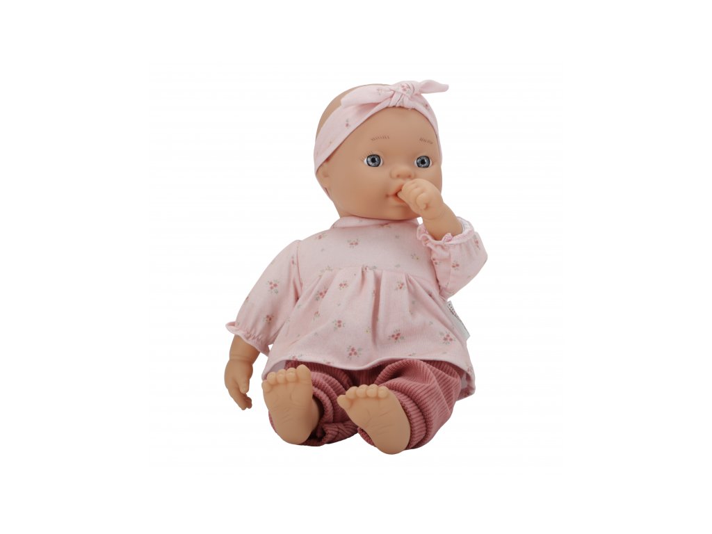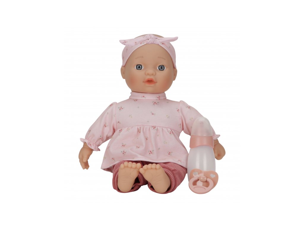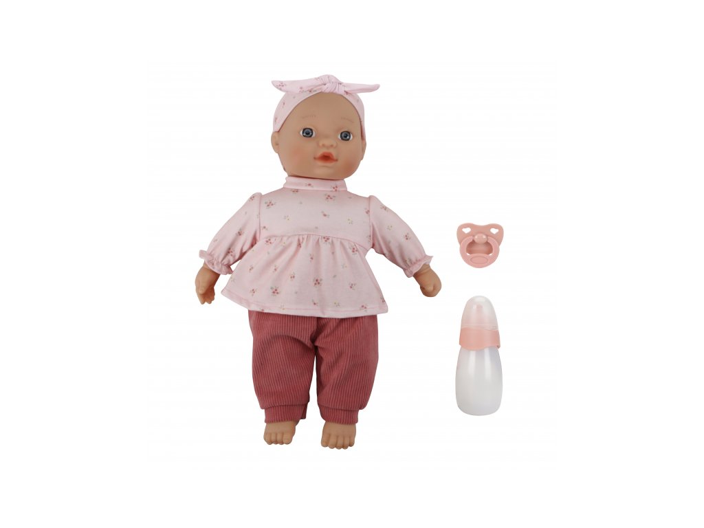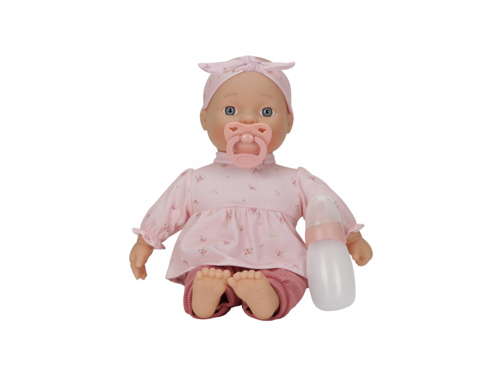 Rozkošnú bábiku v podobe bábätka môže vaše dievčatko aj chlapček prezliekať, správať, kŕmiť fľaštičkou, upokojovať cumlíkom aj voziť v kočíku. Bábika je oblečená do nežných ružových šiat, rebrovaných nohavíc a čelenky, súčasťou balenia je aj fľaštička a cumlík.