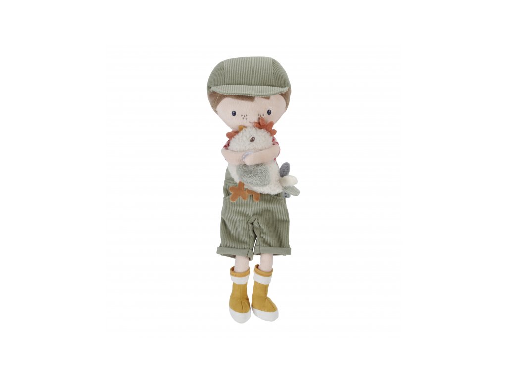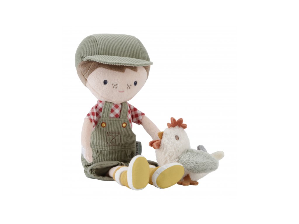 Originálna plyšová bábika v podobe farmára Jima v menčestrových nohaviciach s trakmi a so sliepočkou v ruke. Bábika z mäkkého jemného materiálu je ideálna ako prvá bábika pre vaše dieťa, je vhodná na hranie aj maznanie a bude sa s ňou aj krásne zaspávať!