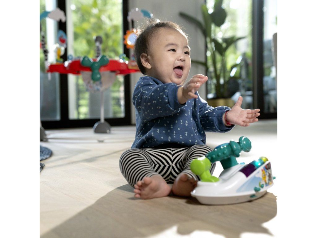 Dieťatko pri každom odraze aktivuje pesničky a svetlá, aby sa dostalo do zmyslovo stimulujúceho vzletu. Odnímateľný elektronický hrací pultík obsahuje 10 interaktívnych komponentov vrátane 7 tlačidiel, plynu a volantu, ktoré pomáhajú dieťaťu pilotovať. Dieťa sa môže učiť tvary, farby a čísla v 4 jazykoch - angličtine, španielčine, francúzštine a nemčine. 7 multisenzorických hračiek a aktivít zapája vývojové zručnosti, ako sú príčina a následok a zručnosť. Obľúbené postavičky Baby Einstein Ocean Explorers, ako Cal, Zen a Neptún, slúžia dieťaťu ako kopiloti.