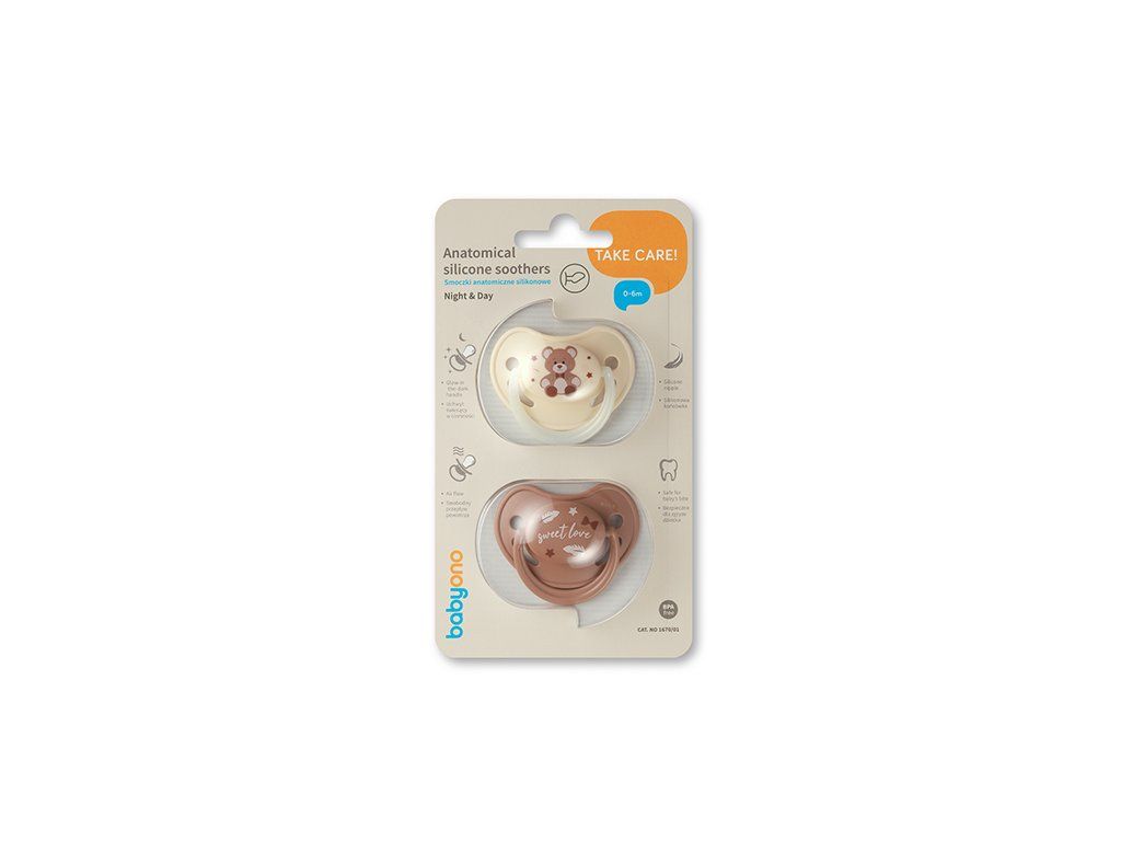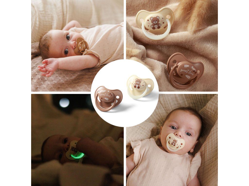 - Denný a nočný cumlík – v balení nájdete jeden klasický a jeden so svietiacou rúčkou, ktorý ľahko nájdete aj v tme