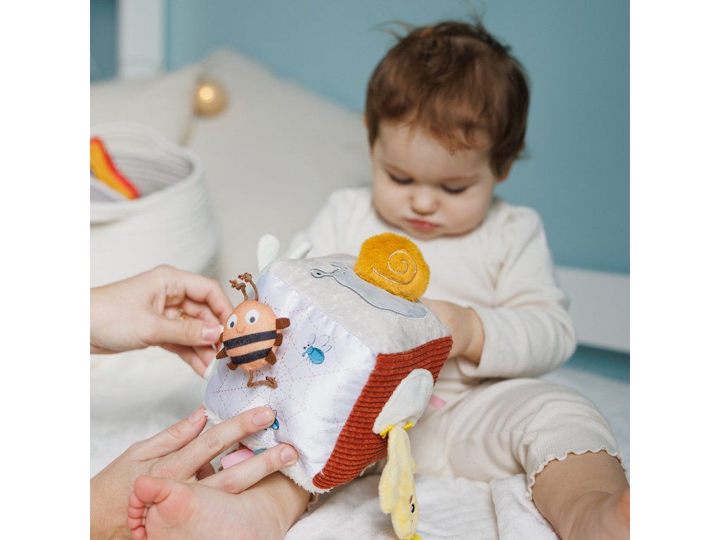 Senzorická kocka Nature upúta pozornosť vášho dieťaťa na dlhú dobu. Obsahuje mnoho skrytých prvkov - zaujme ho a stimuluje sústredenie. Učí logické myslenie a pomáha rozvíjať zmysly od prvých dní života. Prvky produkujúce zvuky rozvíjajú sluch. Rôzne textúry, vyčnievajúce a odnímateľné časti stimulujú hmat. Súčasťou je aj zrkadlo.