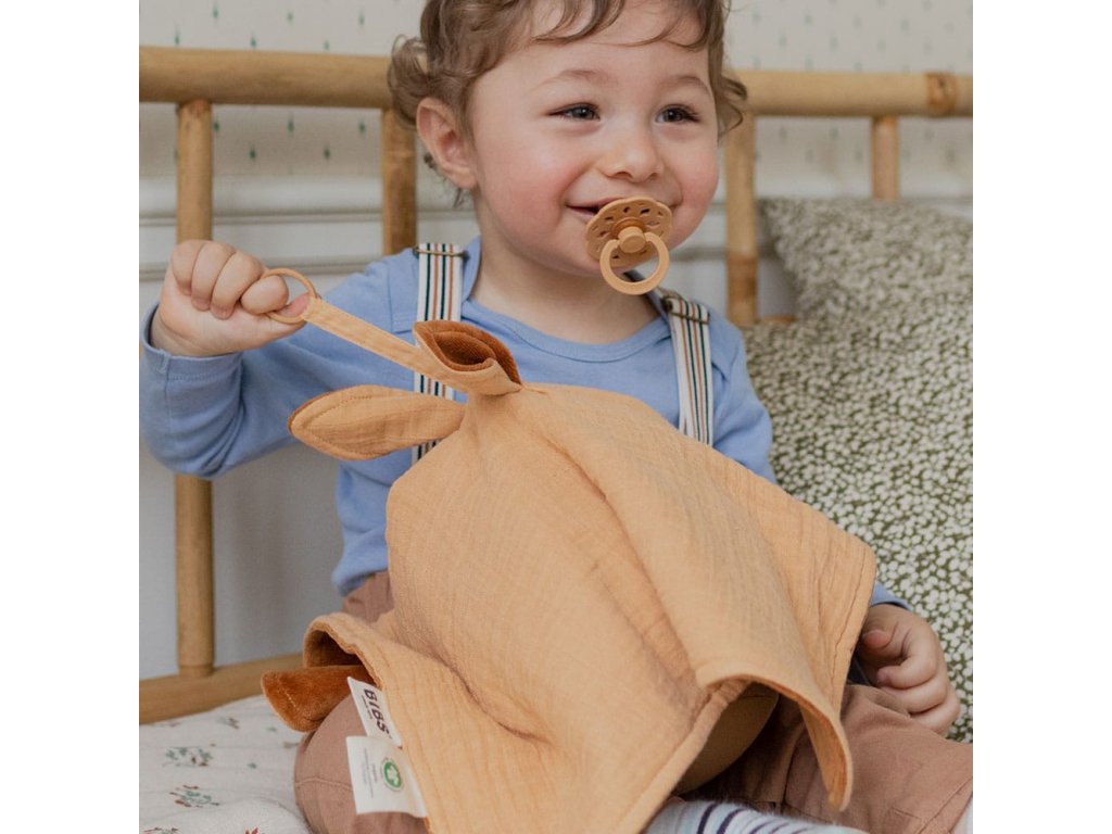 BIBS je obľúbená dánska značka s tradíciou výroby ikonických cumlíkov od roku 1978. Okrem cumlíkov BIBS ponúka aj pestrý prémiový sortiment pre najmenšie deti v minimalistickom škandinávskom dizajne a širokej farebnej palete. Všetky BIBS produkty sú garanciou najvyššej kvality detského sortimentu. BIBS Kangaroo maznáčik je vyrobený zo 100% organickej BIO bavlny. Z jednej strany je to bavlnený mušelín, jemný, hebký a priedušný, z druhej strany česaná prémiová bavlna, mäkučká a príjemná na dotyk. Kvalitu použitého materiálu spoznáte na prvý dotyk. Roztomilé ušká kengurky dopĺňa praktické pútko s krúžkom na upevnenie cumlíka, vďaka ktorému má dieťatko cumlík vždy nablízku. Vhodné je na akýkoľvek cumlík. Roztomilým detailom je malé vrecúško na cumlík, ktoré detičky určite využijú aj na schovávanie svojich drobných pokladov. Maznáčik je najobľúbenejším spoločníkom dieťatka v podstate už od narodenia. Upokojuje a dodáva mu pocit bezpečia, slúži na pritúlenie, pohladenie, na cestách či vonku pripomína vôňu domova. Pre mnohé detičky je takýto mojkáčik nepostrádateľným pri ukľudnení a zaspávaní. Rozmery: cca 40 x 40 cm (po rozprestretí)Zloženie: 100% organická BIO bavlna V súlade s európskym štandardom EN 71-1:2014+A1:2018 a EN 71-2:2011+A1:2014. Starostlivosť: Pranie na 40°C v práčke a sušenie v sušičke na jemný program. Nežehliť, stratil by sa nariasený efekt mušelínu. Nečistiť chemicky. Čím viac sa mušelín perie, tým je mäkší a viac absorbuje vlhkosť. Používanie aviváže môže znižovať absorpčnú schopnosť.