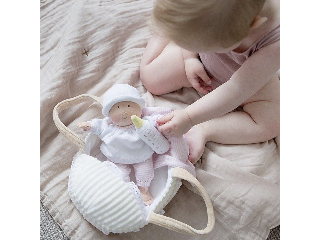 Hra s bábikou rozvíja okrem jemnej motoriky aj schopnosť pomáhať, vcítiť sa, posilňuje vrodený cit pre starostlivosť a cez hrané príbehy napomáha rozvoju fantázie a predstavivosti. Keďže malé deti ešte nevedia vyjadriť svoje emócie slovami, často ich vyjadrujú práve prostredníctvom hry s bábikami, kam prenášajú kúsok svojho vlastného sveta. Jednoduchá bábika bez špeciálnych funkcií, schopností a bateriek neobmedzuje detskú fantáziu a dáva dieťaťu najväčší priestor na sebavyjadrenie. Mäkučká certifikovaná bavlna Výplň – recyklované vlákno z PET fliaš. Precízna ručná práca, kvalitné vypracovanie. Šaty sa dajú vyzliekať. Bábika je príjemne mäkká a preto je vhodná aj na túlenie a na spanie. Bezpečné aj pre najmenších. Testované podľa EU noriem. Obsahuje: košík, bábiku, prikrývku a dojčenskú fľašku (látkové)Výška bábiky cca 24 cm.Vhodné od narodenia.Vyrobené na Srí Lanke vo fair trade podmienkach. Ako vznikla Bonikka Bonikka sa zrodila na Srí Lanke z rodinnej tradície, ktorá vznikla v roku 1895 z jednoduchého skutku s obrovským významom. Otec daroval svojej dcére, ktorá odišla z domu, aby si založila vlastnú rodinu, porcelánovú bábiku na rozlúčku. Bábika jej mala pripomínať, aké pevné je puto rodiny, aká nekonečná je láska a podpora rodičov. Odvtedy táto bábika putovala generáciami a pripomínala ženám tieto dôležité hodnoty. Mano – dnešná riaditeľka rodinnej fabriky na výrobu hračiek DSL Lanka – dostala toto vzácne dedičstvo darom od svojej mamy. Odkaz, ktorý toto gesto nieslo, bol pre ňu tak silný, že sa roky neskôr rozhodla sprostredkovať ho oveľa mladším deťom – dievčatám a chlapcom, ktorí sa práve učia pochopiť kým sú, kam patria a čo pre nich znamená okolitý svet. A tak Mano vytvorila radu výnimočných bábik vyrobených dôkladnou ručnou prácou, zo zdravých prírodných materiálov a nazvala ich Bonikka, čo v Sinhalčine znamená „bábika“.