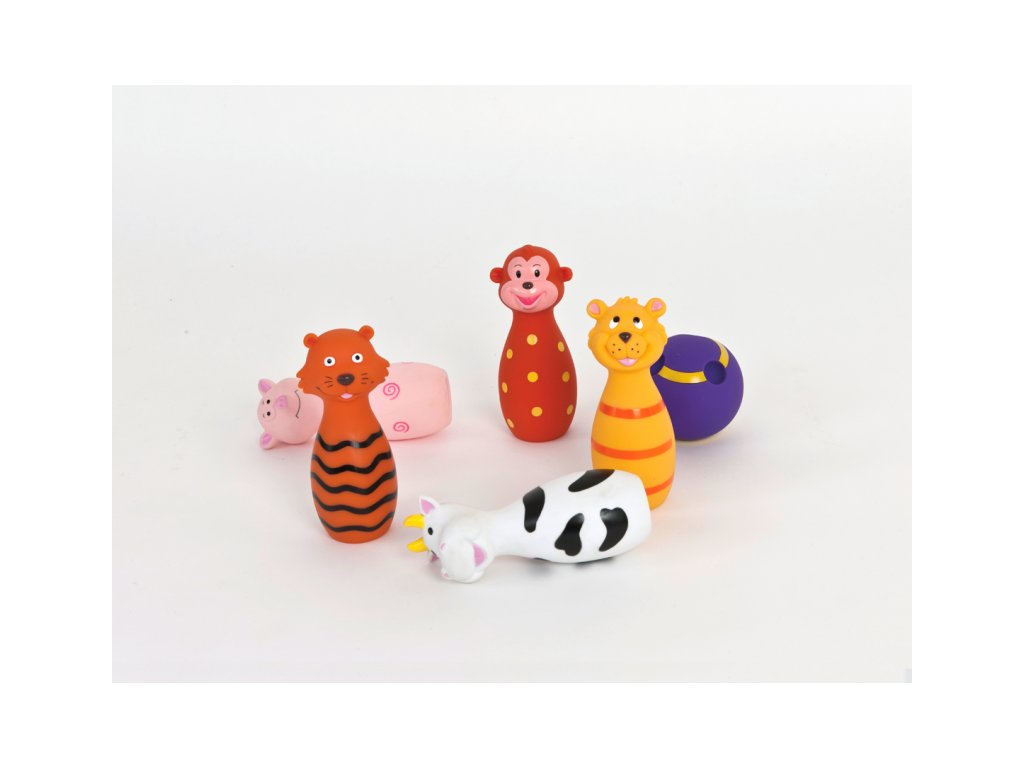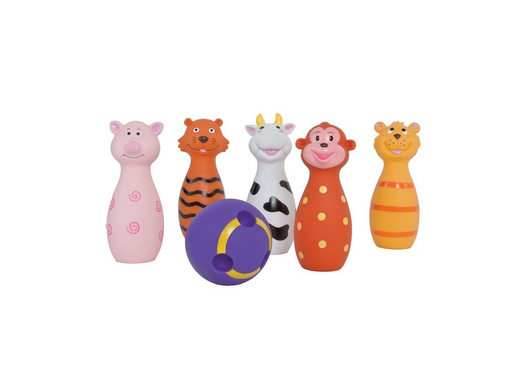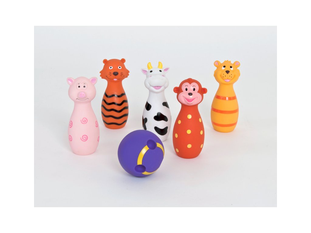 Rozkošná sada piatich kolkov v tvare zvieratiek a gule s otvormi ako pre skutočných hráčov bowlingu. Vyrobené z mäkkého materiálu pre bezpečnú a príjemnú hru. Zvieratká Ludi po stlačení pískajú. Vhodné od 10 mesiacov.