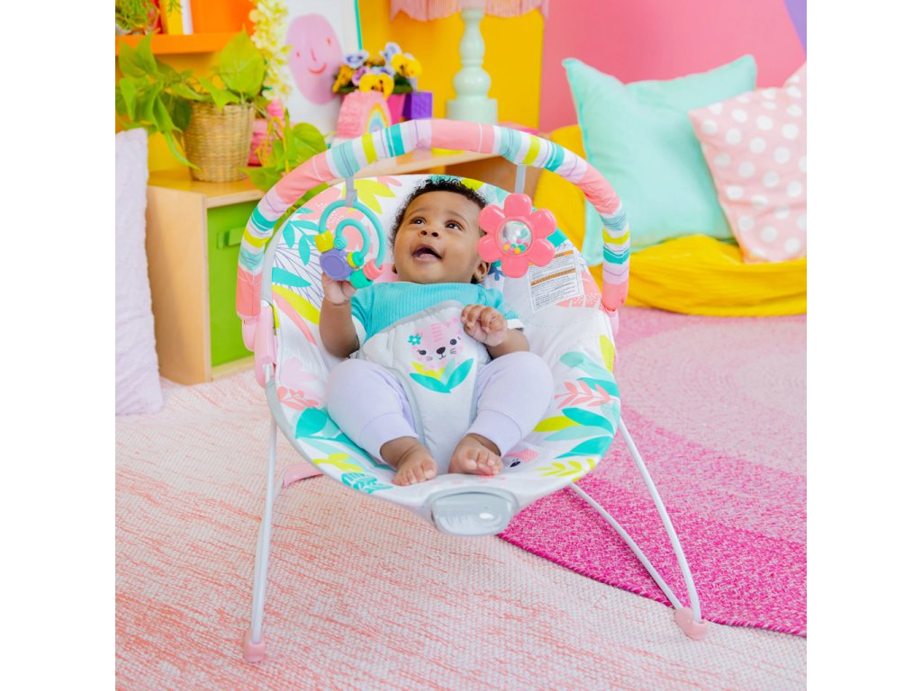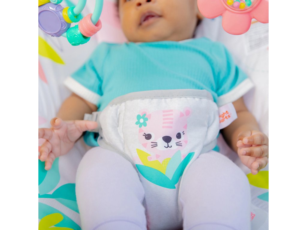 Vibračné lehátko Rainforest Vibes od Bright Starts je tým najdivokejším miestom na sedenie a hranie! Pripravte sa na široké úsmevy, keď sa vaše bábätko začne naťahovať za dvoma farebnými hračkami visiacimi zhora. Vaše malé dieťatko si zamiluje klikanie a hrkálku s korálkami.
