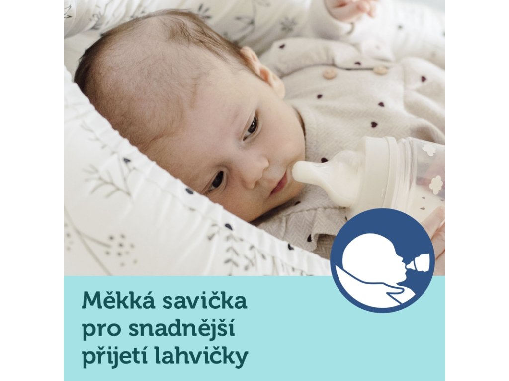 Široké hrdlo uľahčuje plnenie a umývanie, výrazná stupnica potom kontrolu dieťaťom vypitého množstva. Obsahuje antikolikový cumlík 0m +, ktorý svojím tvarom čo najviac pripomína matkinu bradavku. Umožňuje tak dieťa dojčiť aj kŕmiť z fľaše zároveň. Vo fľaši uzavretej tesniacim diskom môžete pokrm zmrazovať alebo transportovať bez rizika vyliatia. Fľaša neobsahuje BPA. Náhradné cumlíky možno dokúpiť.