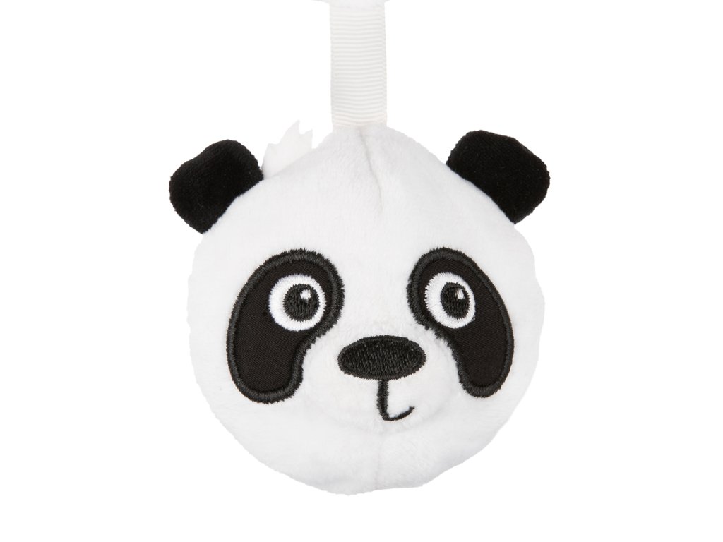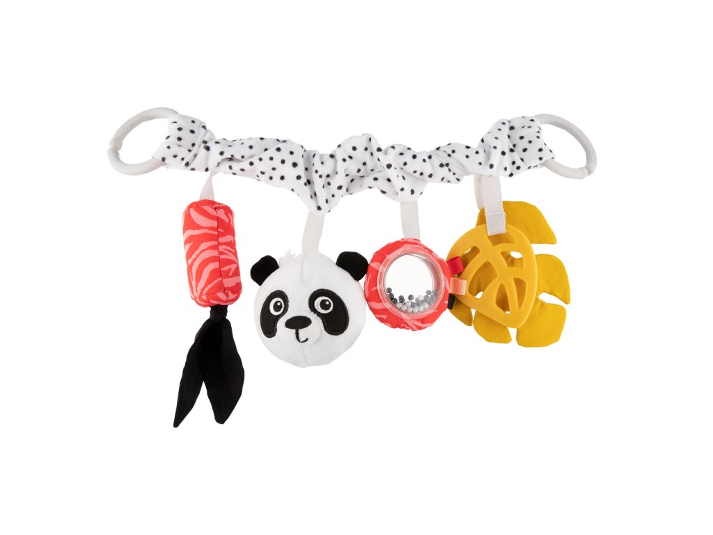 Decentné, ale kontrastné farby povzbudia dieťa k úchopu a hre. Každý prvok závesnej hračky má inú funkciu – zvonček s mašličkou vydáva jemné zvuky. Mäkká plyšová panda, vyrobená z príjemného na dotyk a mäkkého materiálu, si po stlačení zachováva svoj tvar. Zrkadielko obklopené farebnými visačkami s hrkálou a a dva listy – jeden príjemne šuští a druhý v podobe hryzačky prinesie úľavu pri prerezávaní zúbkov.