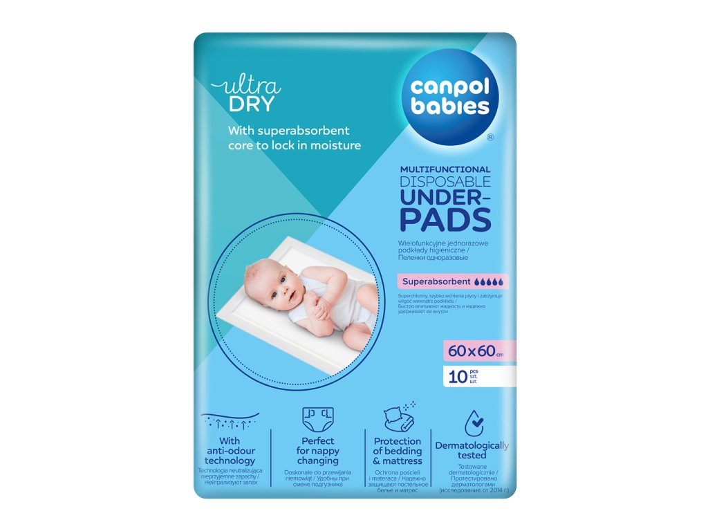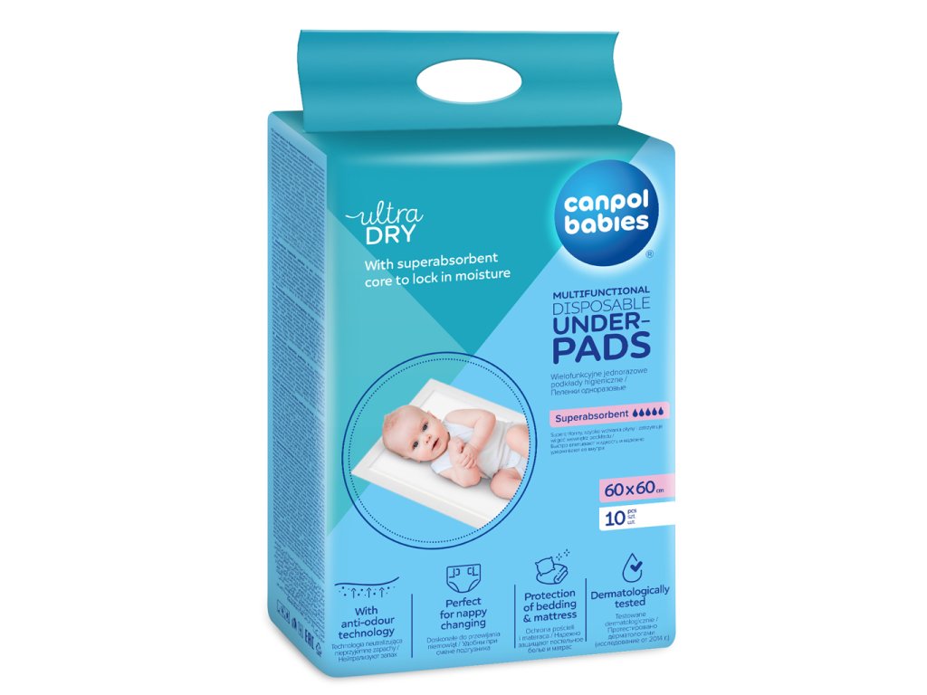 Multifunkčné hygienické podložky Canpol Babies s vodeodolnou ochrannou vrstvou na spodnej strane podložky sú ideálne pre mnohé situácie. Superabsorpčná podložka rýchlo absorbuje tekutiny a zadržiava vlhkosť vo vnútri podložky. Hygienické podložky sú pre ženy v období po pôrode nevyhnutné. Sú užitočné pri prebaľovaní bábätka, pri cestovaní, pri návšteve ambulancie alebo ako ochrana matraca (pretekajúca plienka, odgrgnutie a pod.) a pri učení sa vyzliekať.