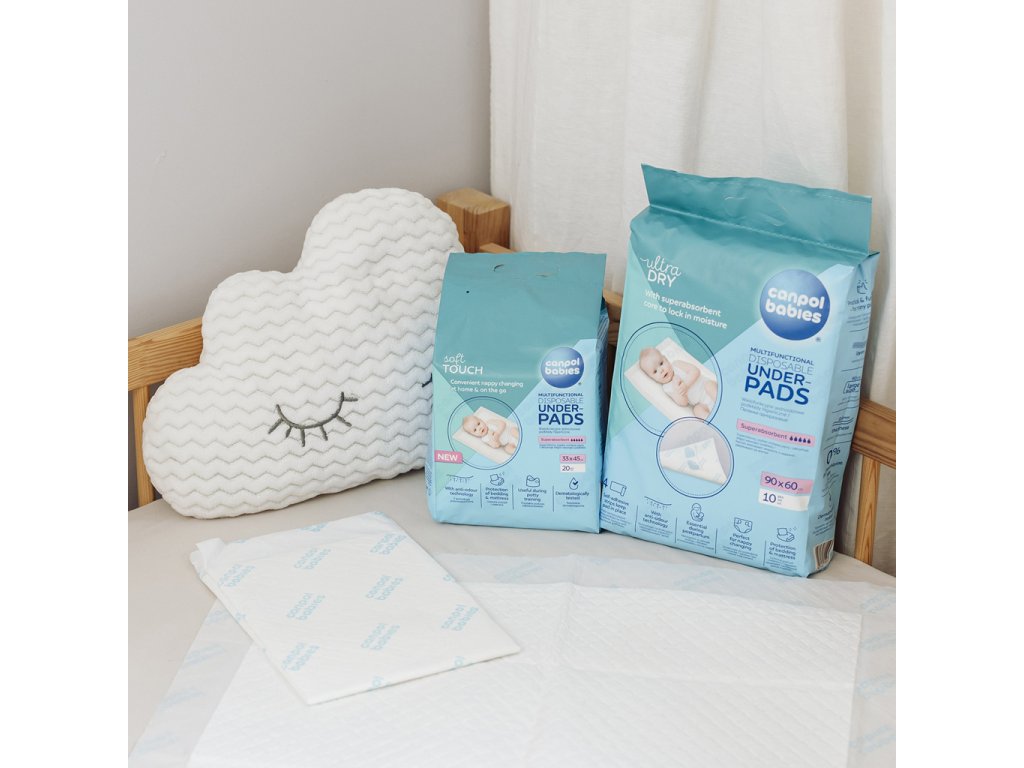 Hygienické multifunkčné podložky s vodeodolnou ochrannou vrstvou na spodnej strane sa hodia pre akúkoľvek situáciu. Vždy poskytujú čistý a hygienický povrch na prebaľovanie vášho bábätka. Sú užitočné pri cestovaní, na prechádzke, pri návšteve kliniky, ako ochrana matraca alebo kočíka (pretekaniu plienky, rozliatiu atď.) a pri učení na nočník. Superabsorpčná podložka rýchlo a účinne absorbuje tekutiny a zadržuje vlhkosť vo vnútri spodnej podložky, čím chráni pred únikom.