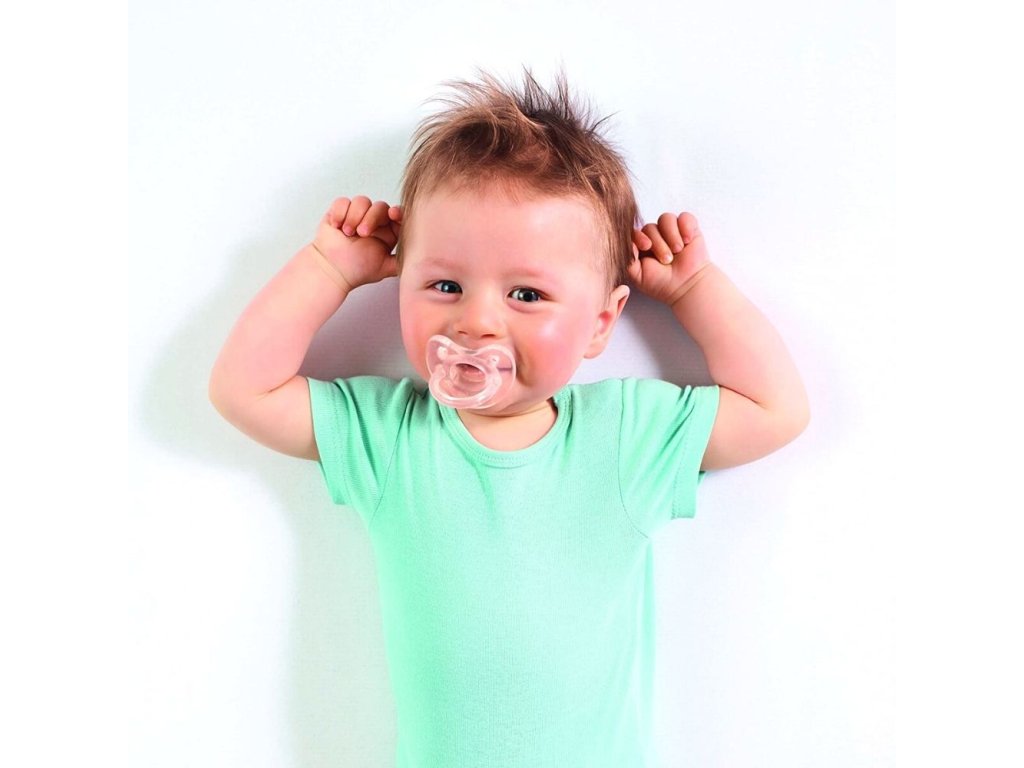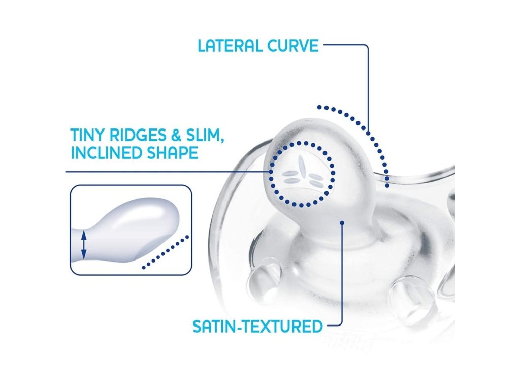 - extrémne mäkká zúžená pätička cumlíka umožňuje dieťaťu zavrieť ústa a redukuje riziko nerovnomerných zubných oblúkov (je ortodonticky korektná)