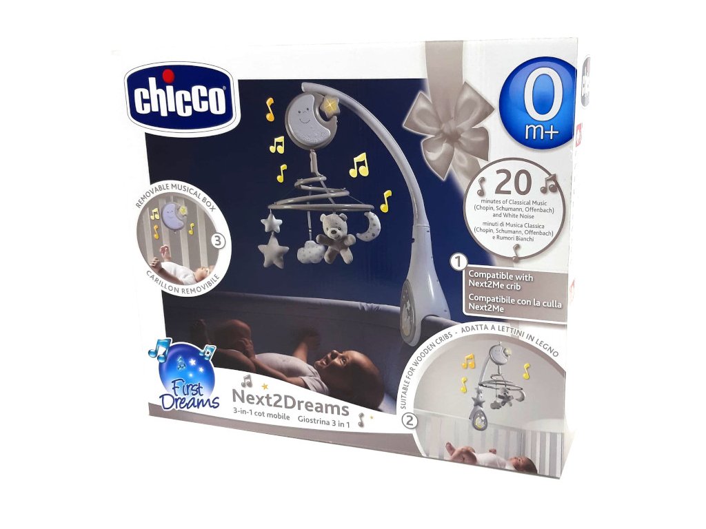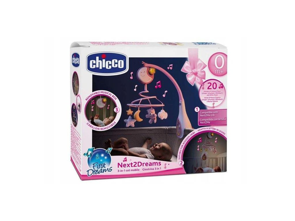 Výnimočný, všestranný hudobný kolotoč na postieľku so svetielkami, hudbou a otáčajúcou špirálou je jediný kolotoč kompatibilný s Next2Me postieľkami a zároveň vhodný na väčšinu drevených postieľok vďaka jednoduchému systému prichytenia. Okrem hudobného kolotoča Next2Dreams poslúži aj ako nočné svetielko a po odňatí kolotočového nadstavca možno hraciu a svietiacu skrinku zavesiť na bok postieľky, na úchyt autosedačky či do kočíka. Next2Dreams je blízko vás a snov vášho dieťatka.