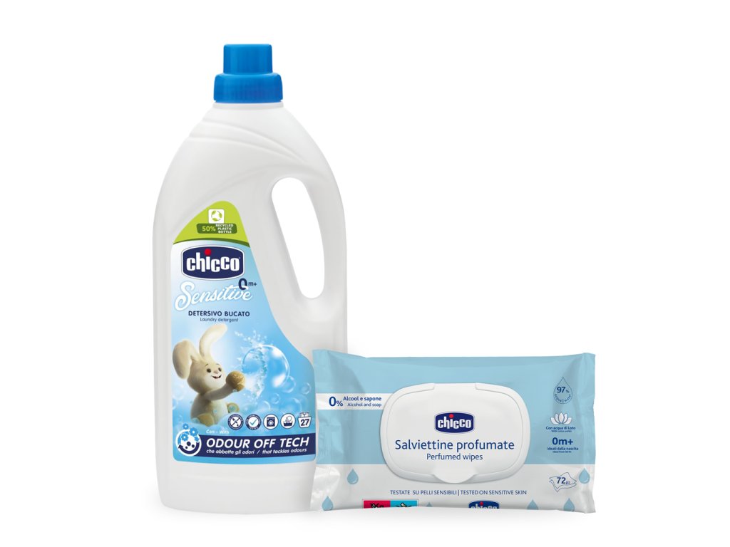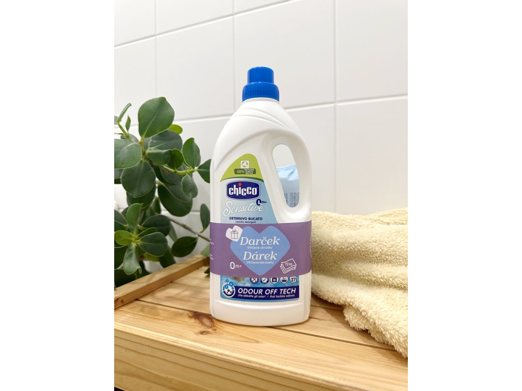 CHICCO Prostriedok prací detský Sensitive 1,5 l (27 praní) + vlhčené obrúsky 72 ks zadarmo