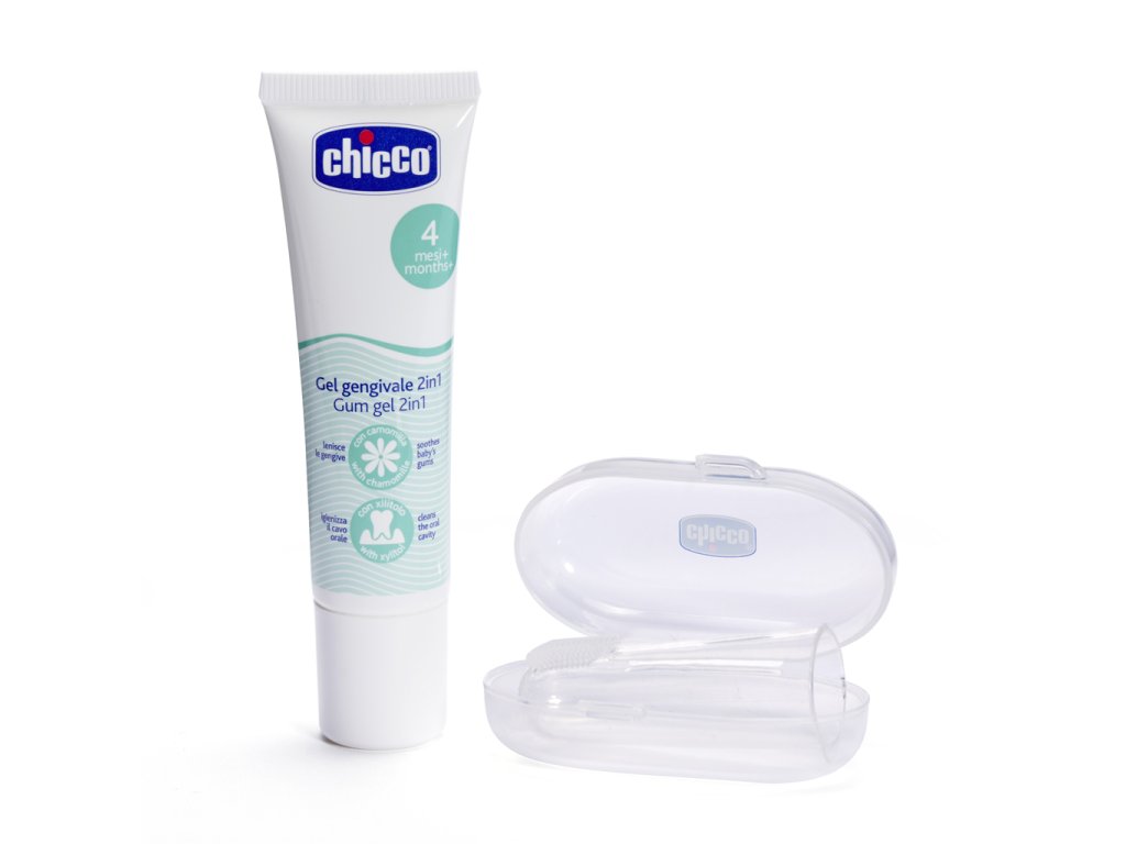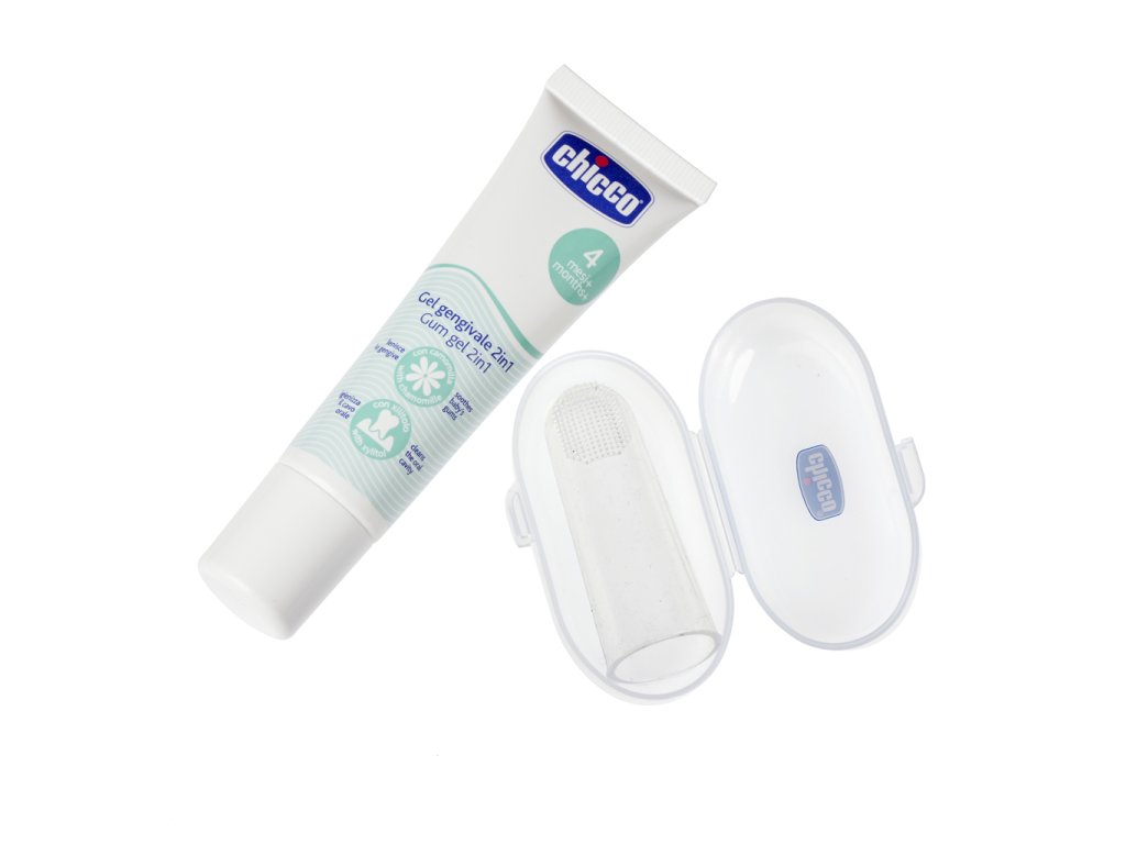CHICCO Set zubný upokojujúci gél a kefka na prst s puzdrom 4m+