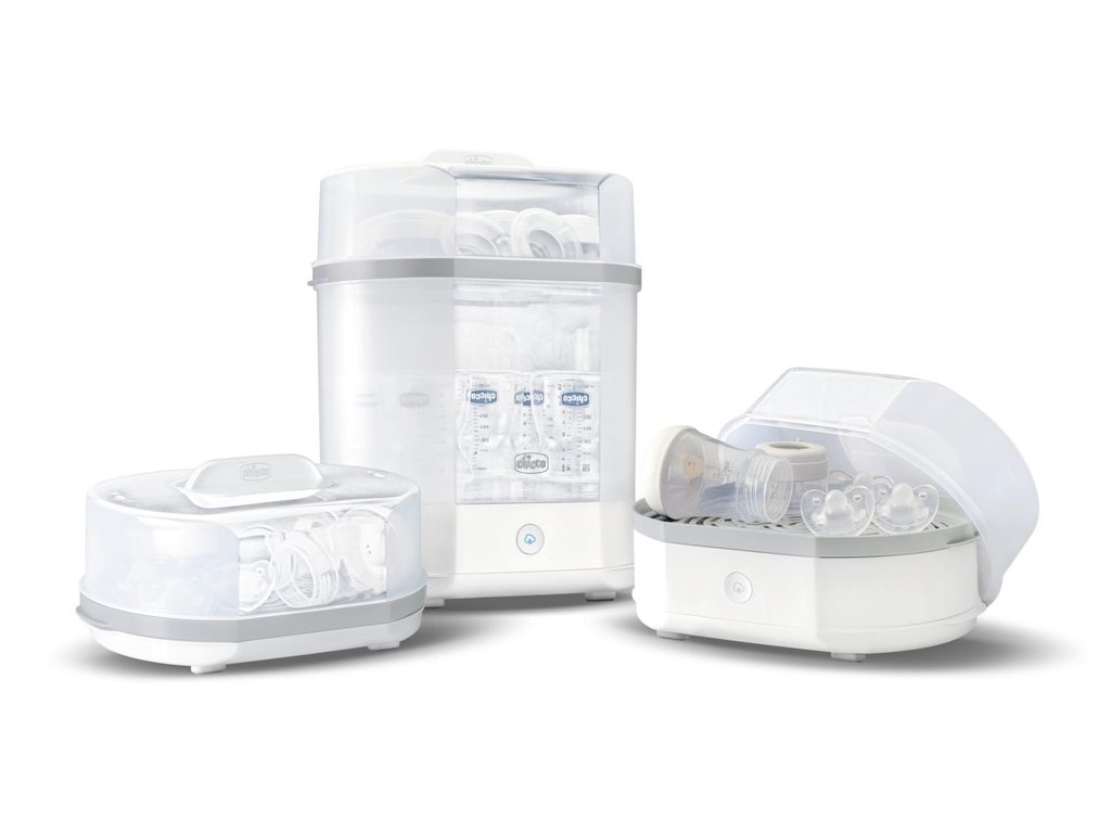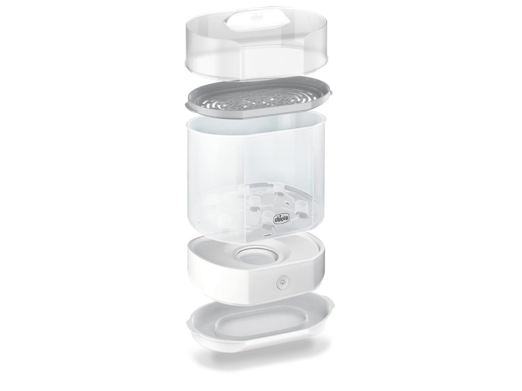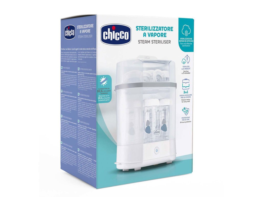 Bolesti bruška, koliky, hnačka a vracanie často sprevádzajú nedostatočnú hygienu pri manipulácii s dojčenskými predmetmi na kŕmenie. V prvých mesiacoch života sú deti veľmi citlivé na baktérie, mikróby a vírusy, pretože ich imunitný systém ešte nie je úplne vyvinutý. Sterilizátor spoľahlivo ničí choroboplodné zárodky všetkého druhu, ktoré sa šíria na fľašiach, cumlíkoch a inom príslušenstve fliaš. Modulárny sterilizátor 3v1 od Chicco eliminuje 99,9% všetkých choroboplodných zárodkov a sterilizuje bez chemických prísad.