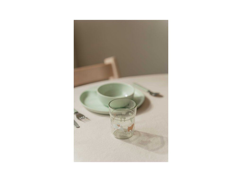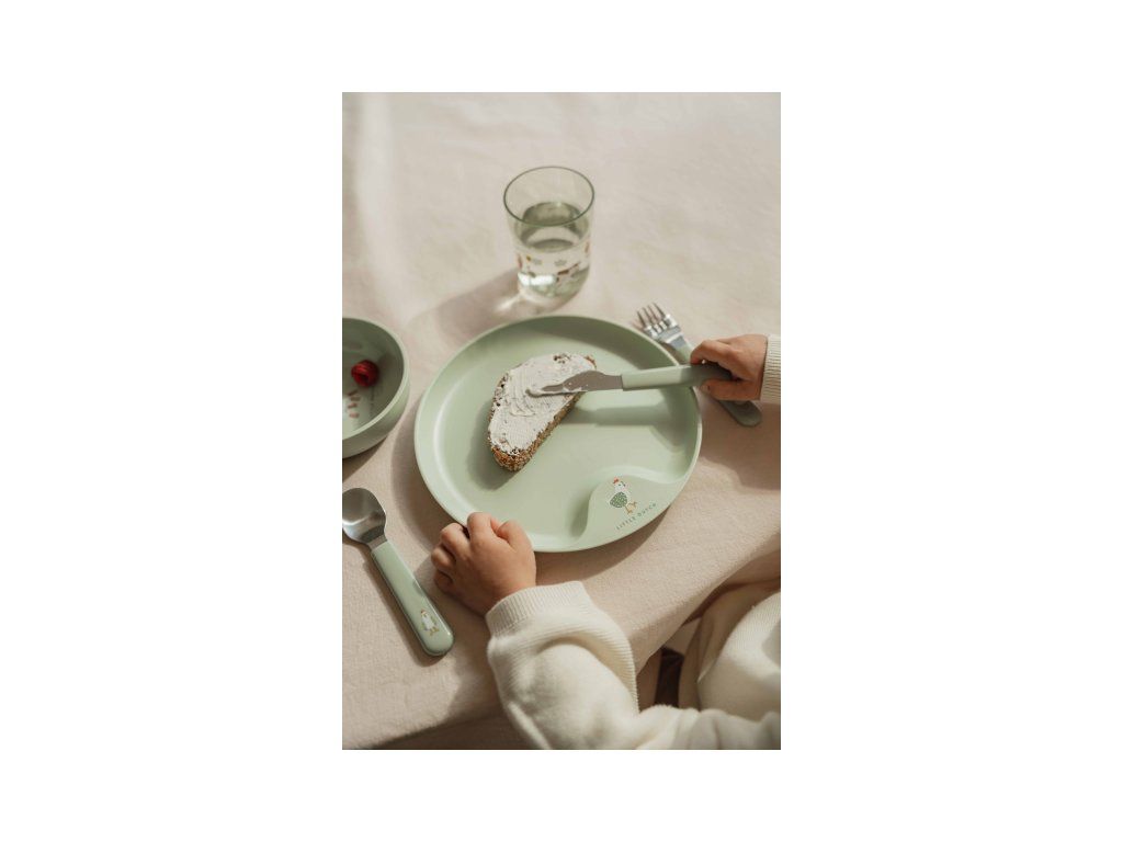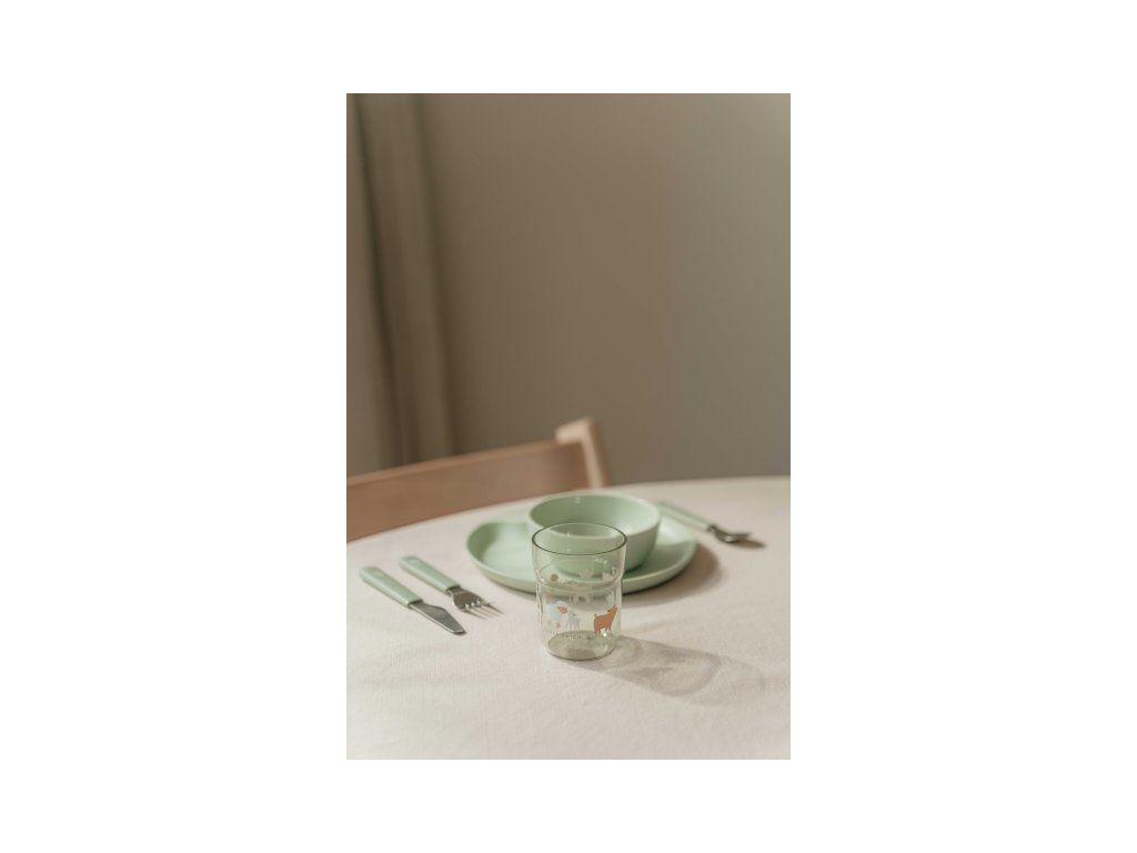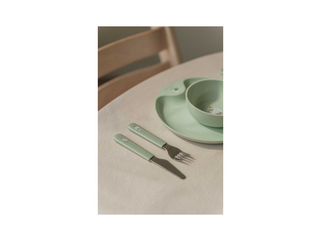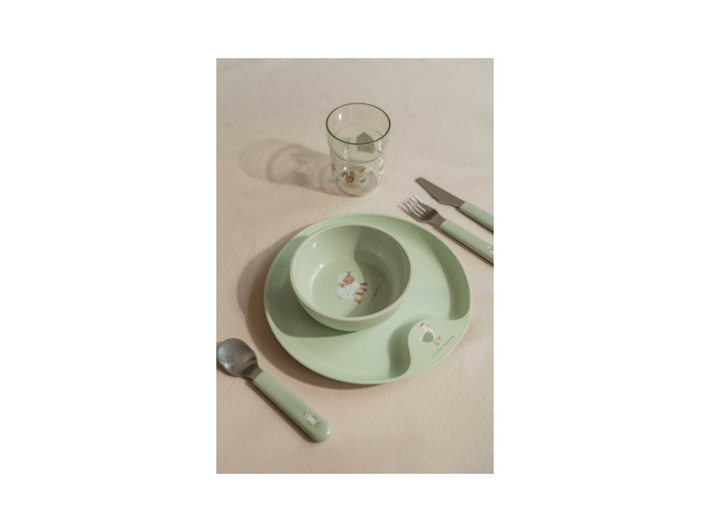 Detský tanier je vhodný na samostatné stolovanie dieťaťa, vďaka praktickému úchytu sa ľahko prenáša. Miska je ideálna na servírovanie detským zeleninových či ovocných príkrmov, polievok, kaší, ovocia a pod. Tanier aj miska sú vyrobené z ľahkého, mimoriadne odolného plastu. Téglik z priehľadného, odolného plastu je ideálny pre deti, ktoré sa učia piť z pohára. Príbor z kvalitnej nerezovej ocele s plastovou rukoväťou pre ľahké držanie uľahčí dieťaťu prechod z kŕmenia lyžičkou na stolovanie s príborom.