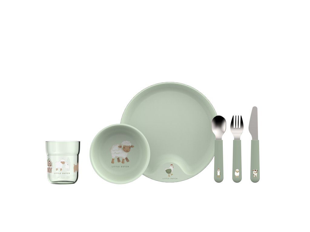 6-dielna jedálenská súprava v krásnom dizajne s jemnou potlačou obsahuje detský tanier, misku, téglik, lyžicu, vidličku a nôž.