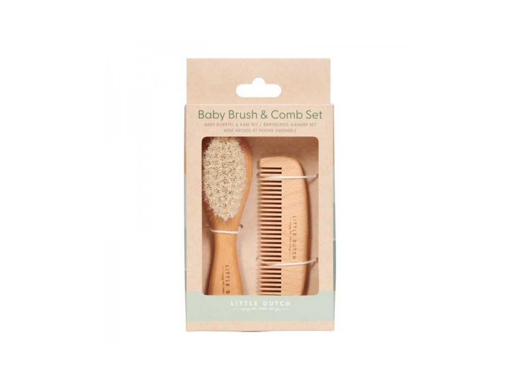 Sada na každodennú starostlivosť o detské vlásky obsahuje drevenú kefu s mäkkými štetinami a hrebeň so širokými zubami, ktoré sú šetrné k citlivej pokožke hlavy bábätka.