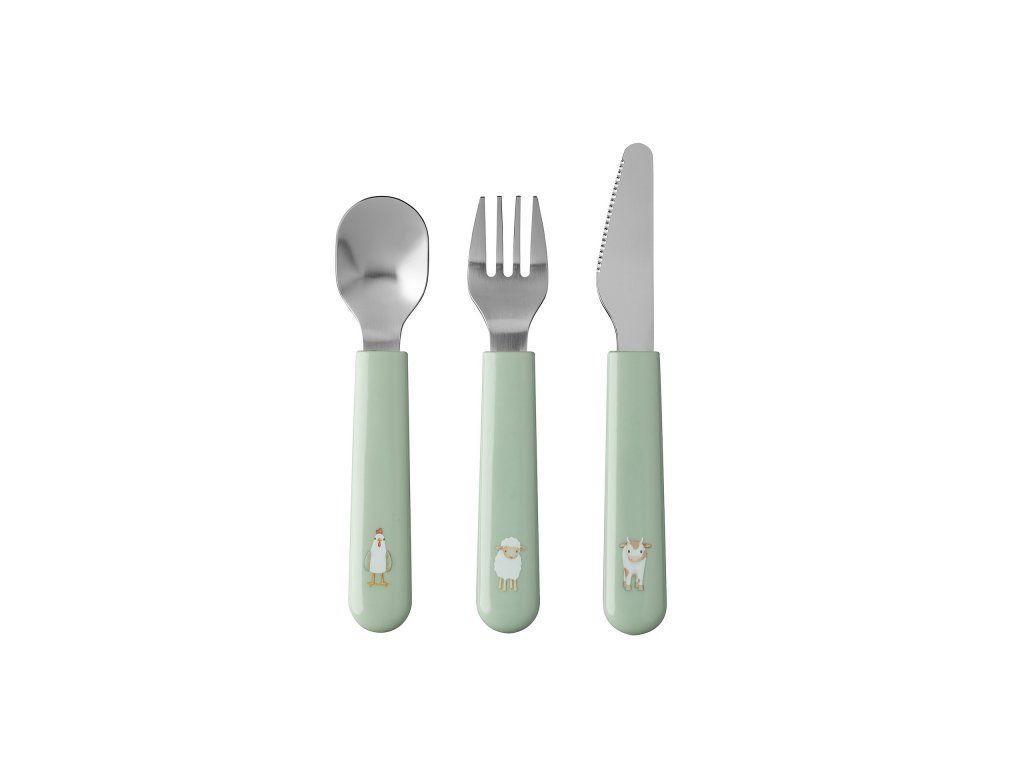 3-dielna sada príboru z kvalitnej nerezovej ocele s plastovou rukoväťou pre ľahké držanie s krásnou potlačou. Nôž má bezpečný zúbkovaný okraj.