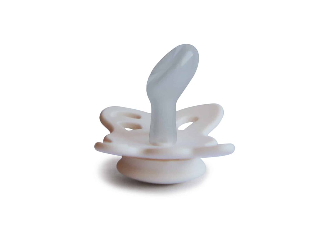 Tvar cumlíkov FRIGG Butterfly pripomína motýľa. Štít so zvlnenými okrajmi má veľké vzduchové otvory pre väčšiu bezpečnosť a jeho okrúhly stred krásne zvýrazňuje eleganciu cumlíkov.