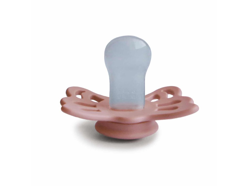 Tvar cumlíkov FRIGG Butterfly pripomína motýľa. Štít so zvlnenými okrajmi má veľké vzduchové otvory pre väčšiu bezpečnosť a jeho okrúhly stred krásne zvýrazňuje eleganciu cumlíkov.