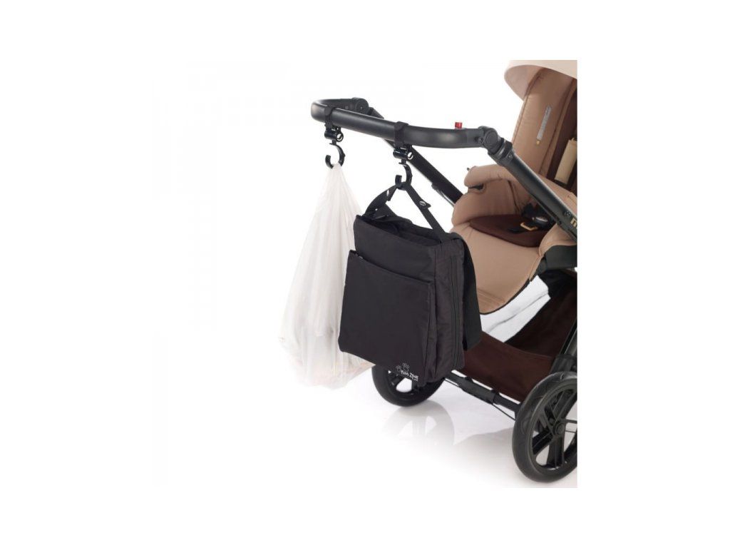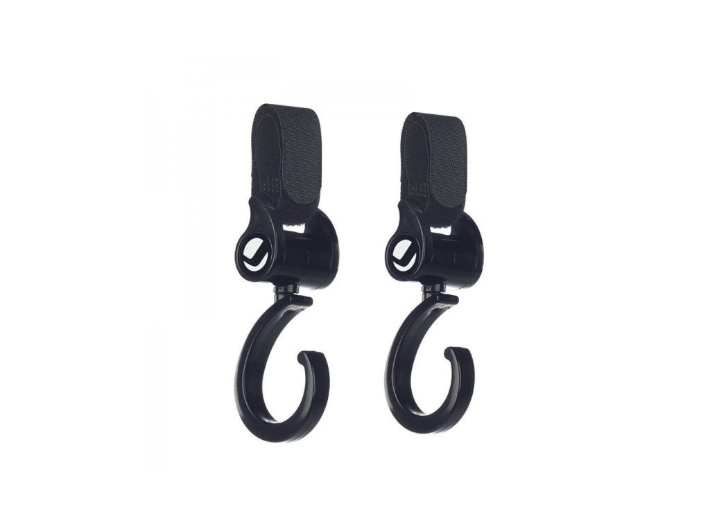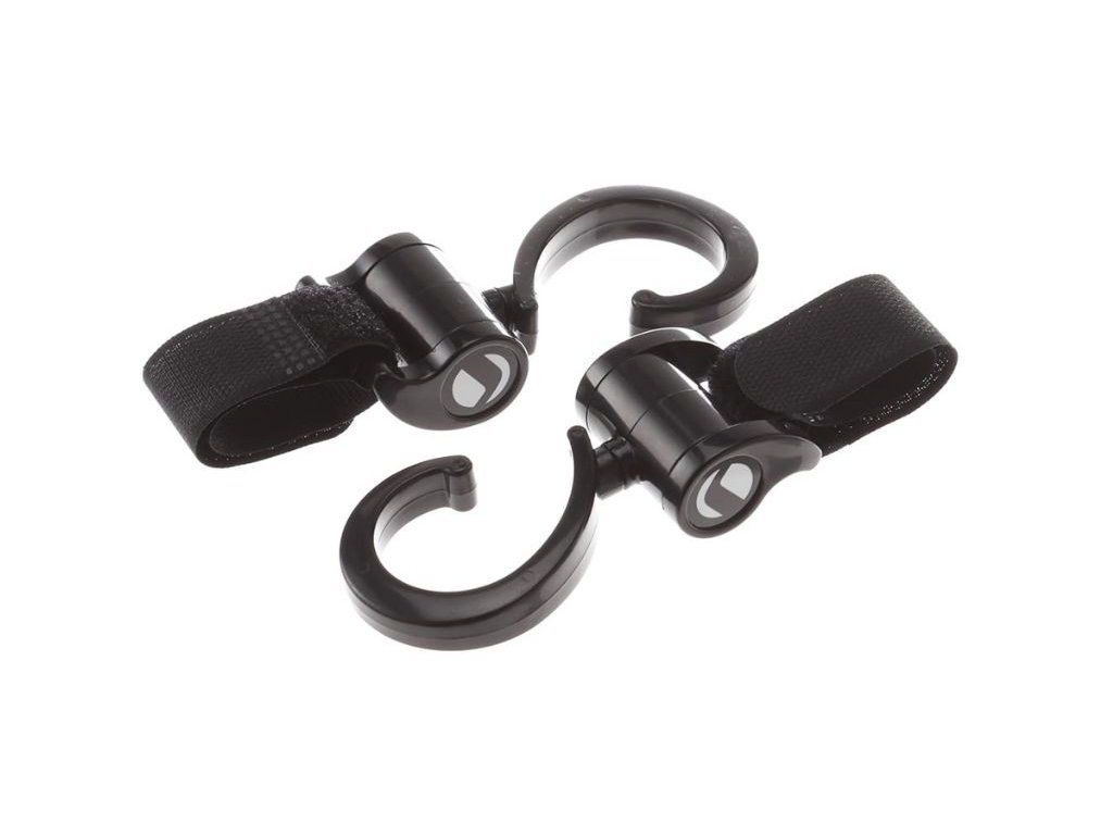 Háčiky na zavesenie kabelky či tašky na rukoväť kočíka ľahko pripevníte na kočík vďaka nastaviteľným úchytom so suchým zipsom.