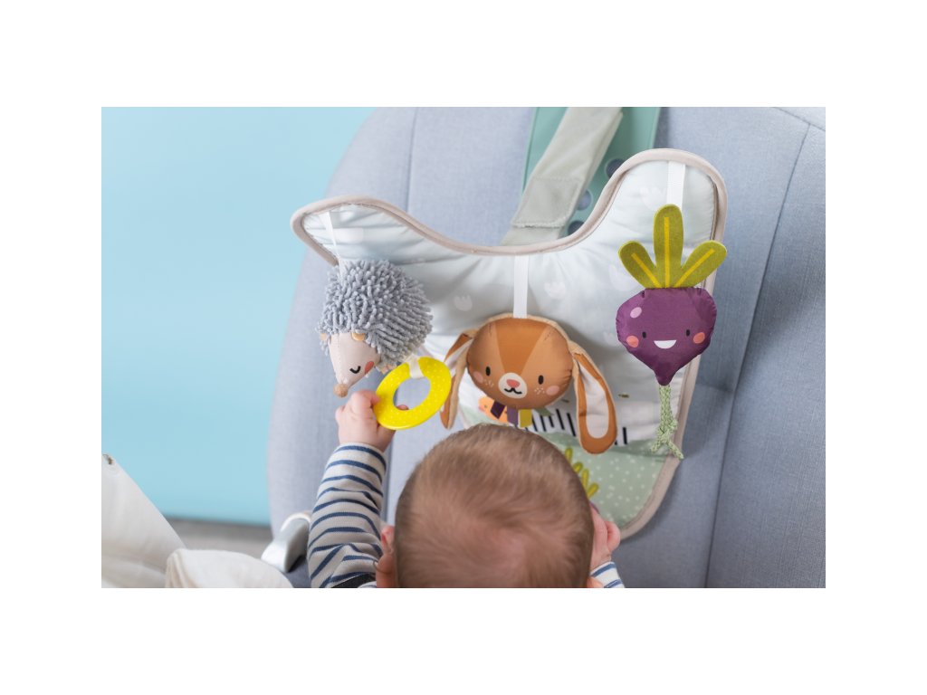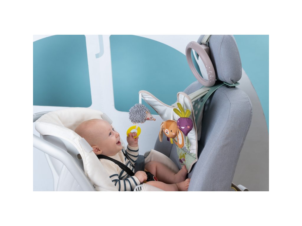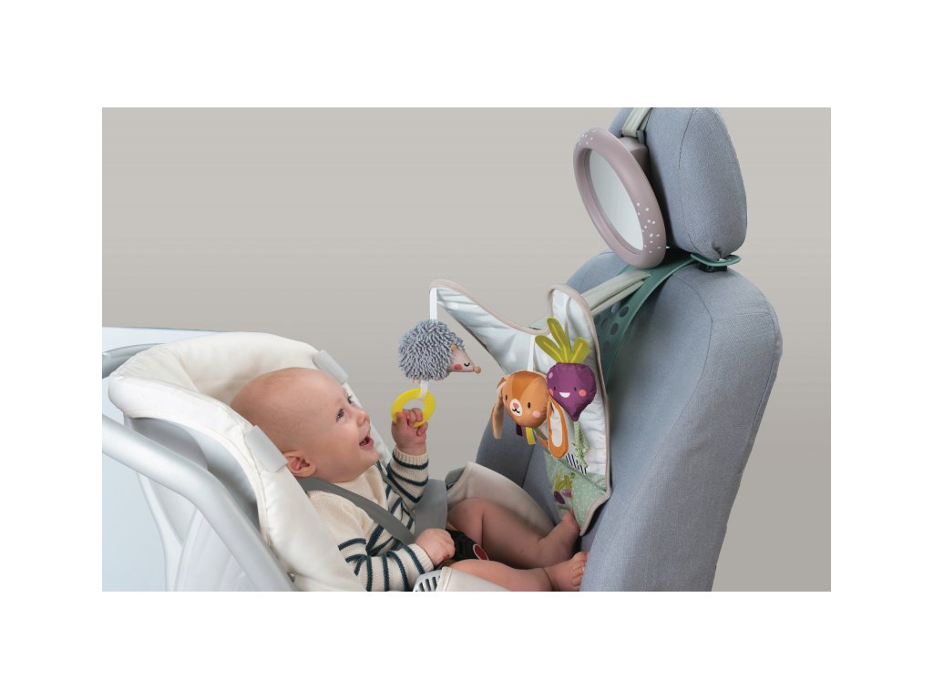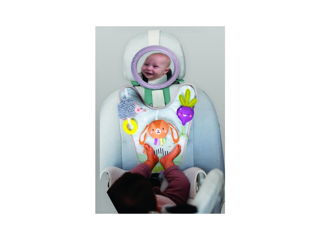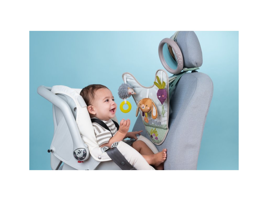 Hrací pultík so zavesenými textilnými hračkami a krásnymi ilustráciami zo života na záhrade zabaví počas jazdy dieťa sediace v autosedačke proti smeru jazdy. Veľké spätné zrkadlo umožňuje rodičovi dieťa sledovať počas jazdy.