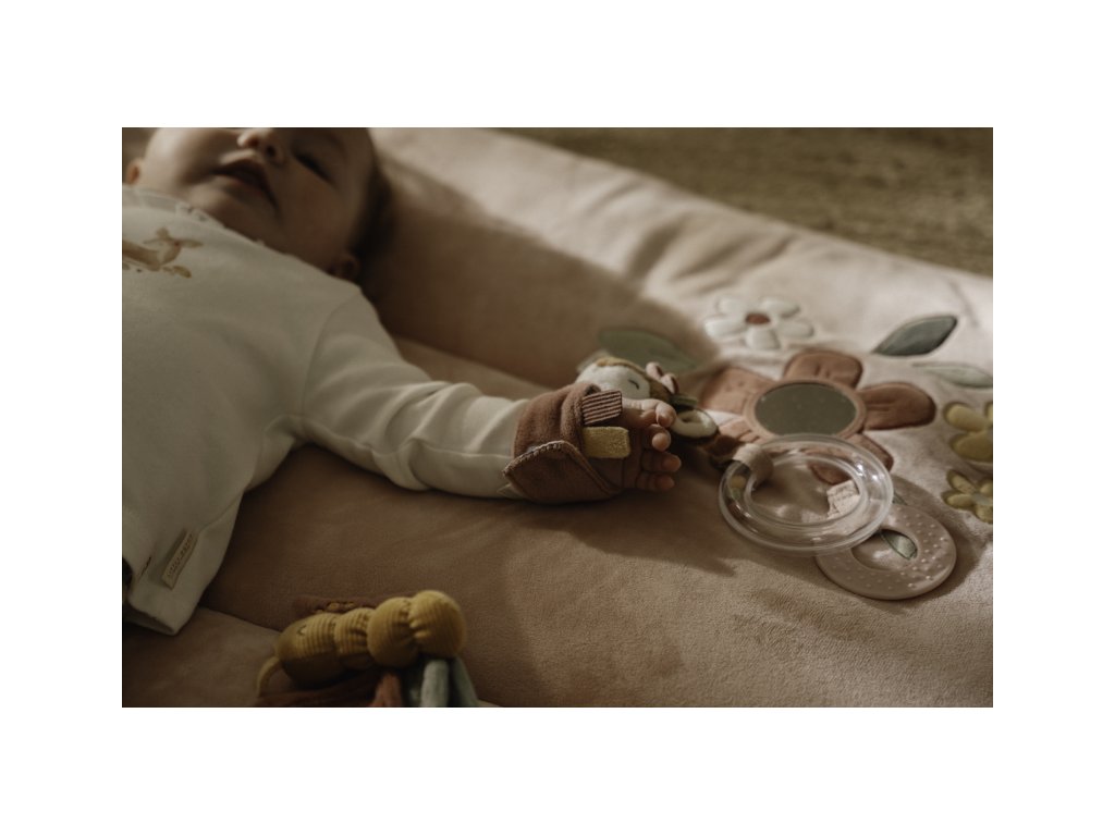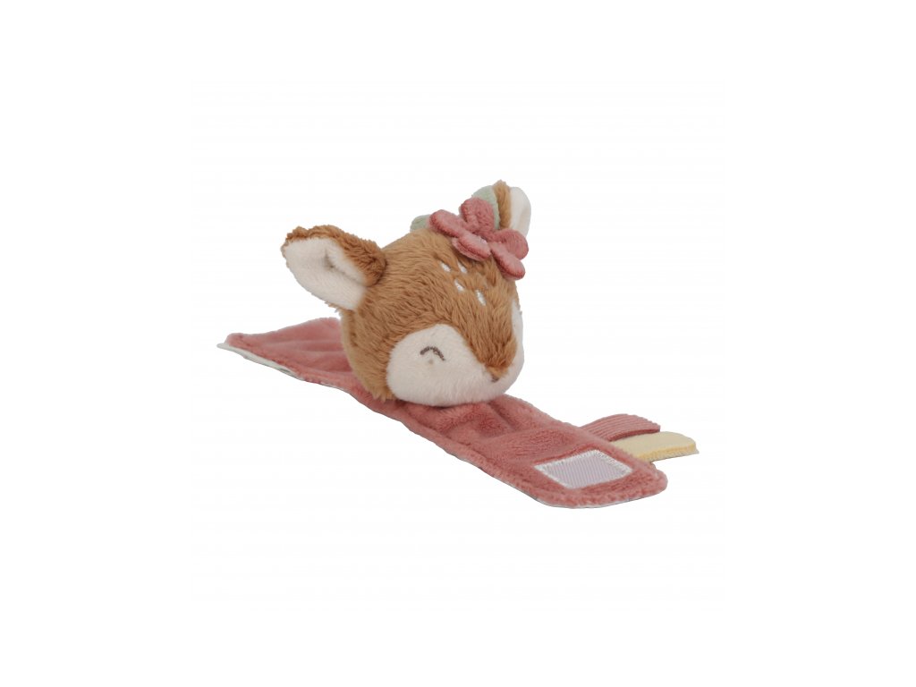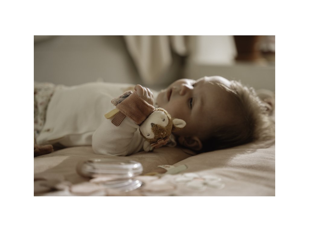 Mäkká hrkálka s rozkošnou srnkou ľahko pripevníte na ruku dieťaťa s pomocou úchytu na suchý zips. Hračka z jemného plyšového materiálu hrká, šuštia a láka dieťa na skúmanie.