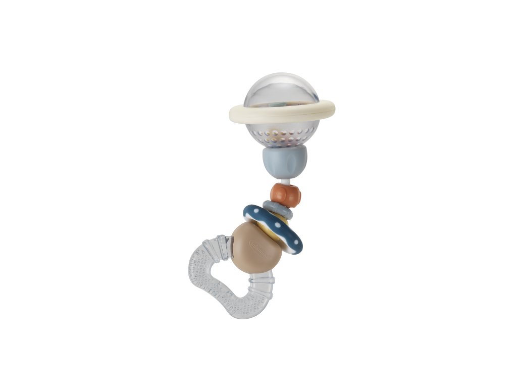 Hrkálka s hryzátkom Infantino zaujme vaše bábätko hrkajúcimi farebnými korálkami v priehľadnej guličke aj ohybnou konštrukciou s posuvnými korálkami. Hryzátko naplnené vodou je možné ochladiť v chladničke pre väčšiu úľavu pri prerezávaní prvých zúbkov.