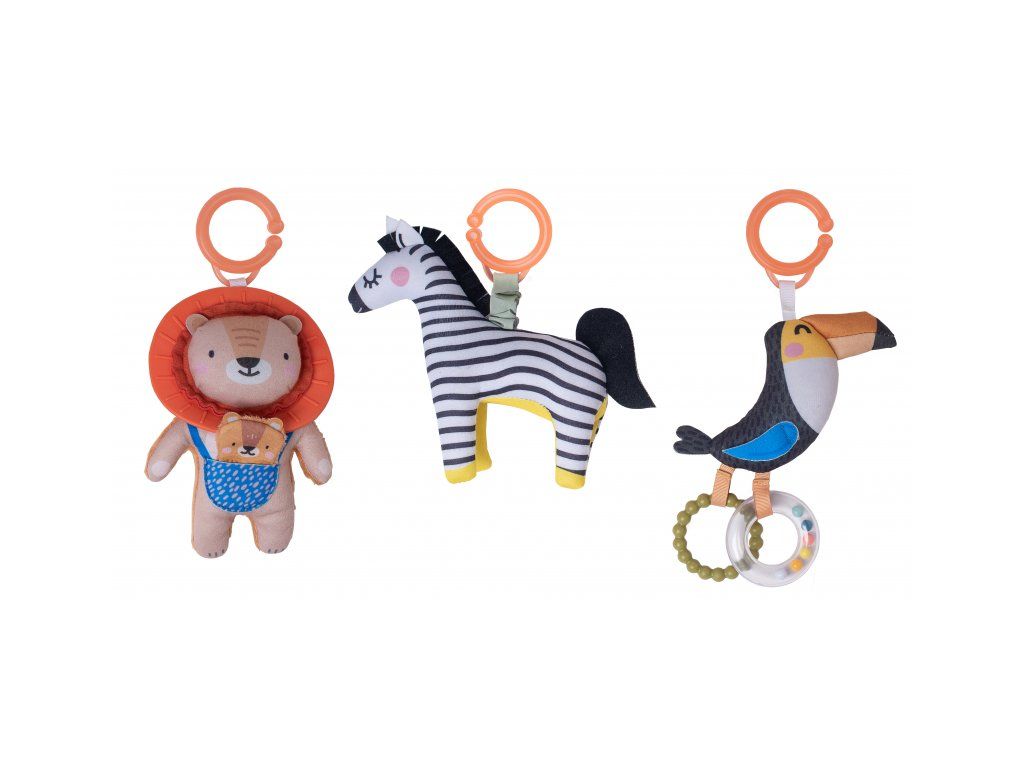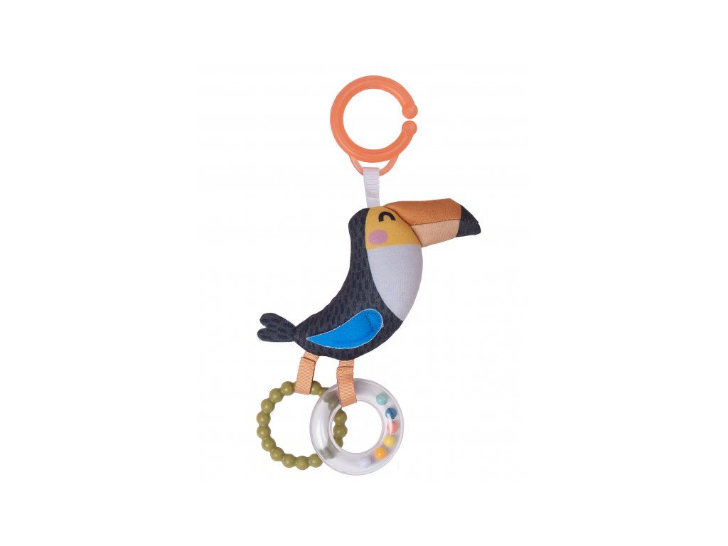 Závesná hračka v podobe tukana Tukiho pri pohybe hrká. Súčasťou hračky je priehľadný hrkajúci krúžok s korálkami a krúžok slúžiaci ako hryzátko.