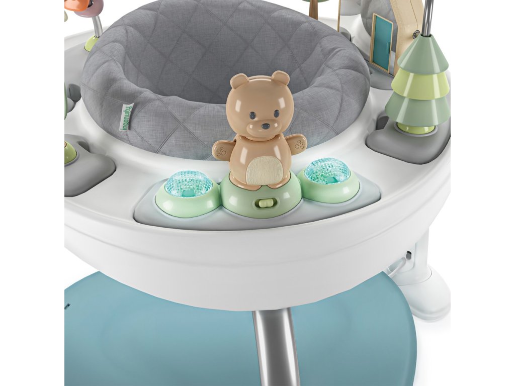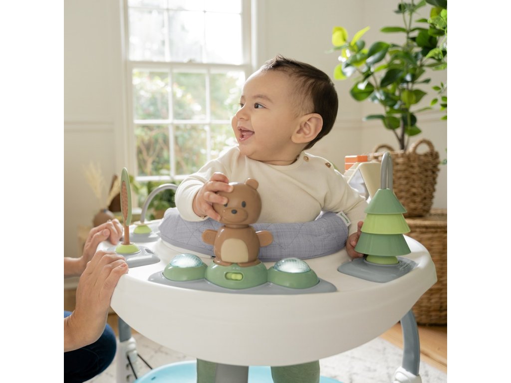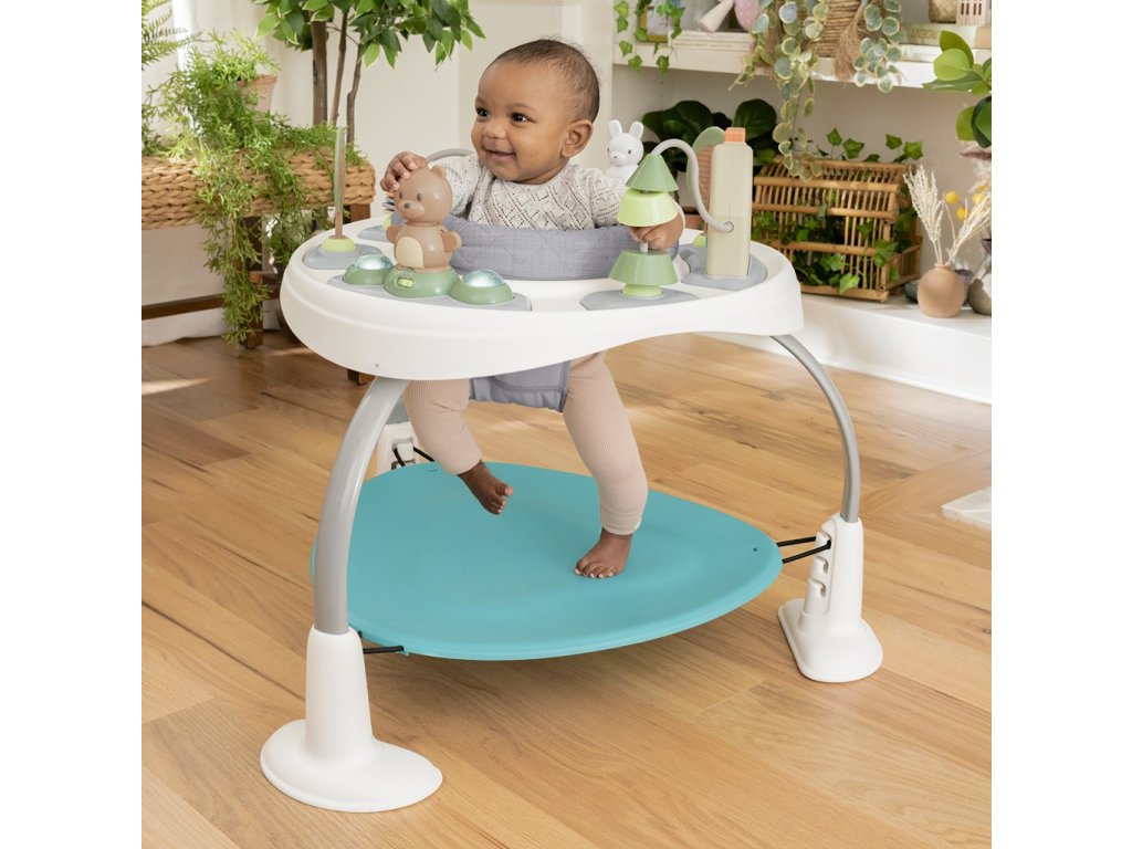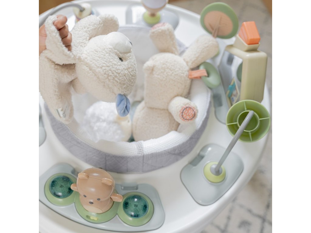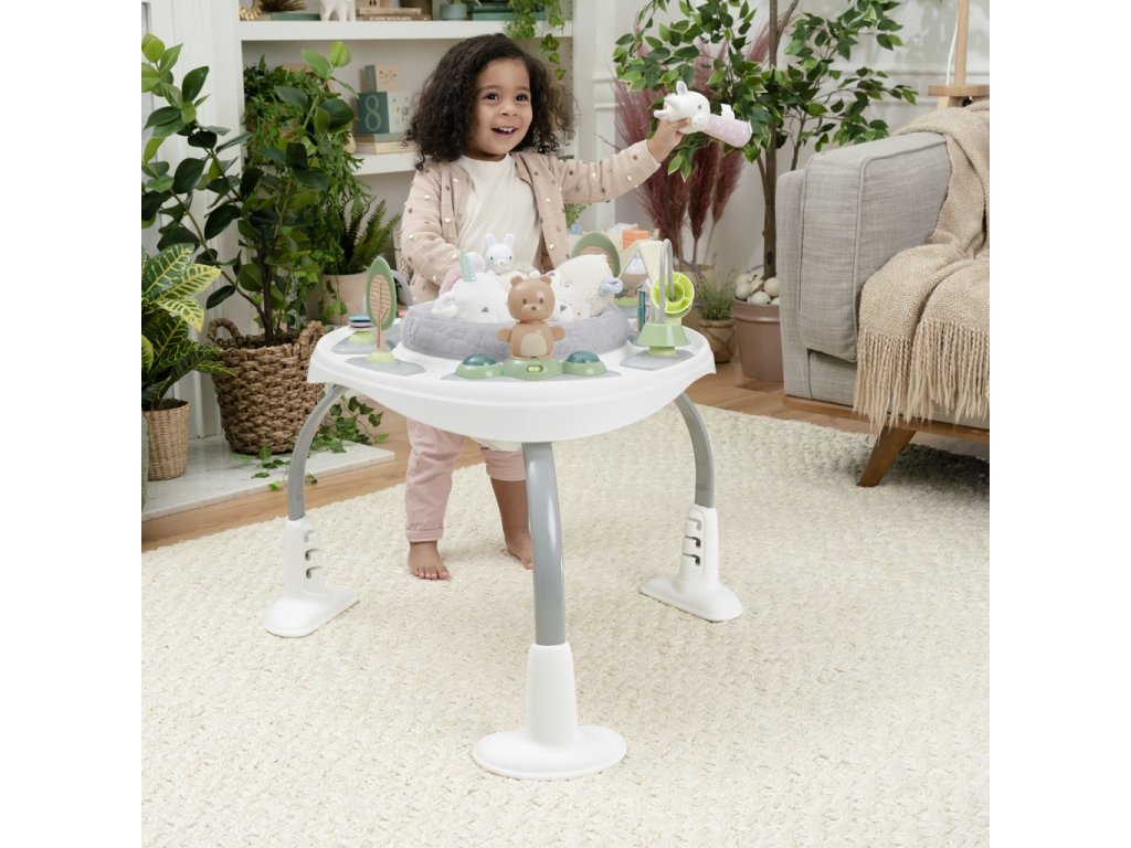 Zo sedadla a skákadla sa postupne stane stolík na hranie s aktivitami pre batoľatá aj so sieťkou na odkladanie hračiek. Aby si dieťatko mohlo oprieť nožičky alebo skákať od radosti v správnej výške je možné nastaviť výšku pružnej podložky na nohy do 3 rôznych polôh, podľa potreby dieťatka. Sedadlo skákadla sa otáča o 360 ° pre ľahký prístup ku všetkým hračkám a činnostiam. Interaktívny macko vydáva hravé zvuky, prehráva hudbu a svieti, čo aktivuje viaceré zmysly vášho dieťatka. Keď dieťa vyrastie, jednoducho vyberte podložku na skákanie a vytvoríte tak stojaci hrací stolík. Ľahko zameníte detské sedadlo za úložnú sieťku na hračky. Takto udržíte poriadok pri hrách, ale stále máte obľúbené hračky na dosah. Deti budú milovať 11 pútavých aktivít inšpirovaných prírodou so svetlami a zvukmi ako napríklad aktívny panel s medvedíkom, korálky na prevliekanie, domček so stromami. Neutrálny decentný dizajn, ktorý sa hodí do každého interiéru.