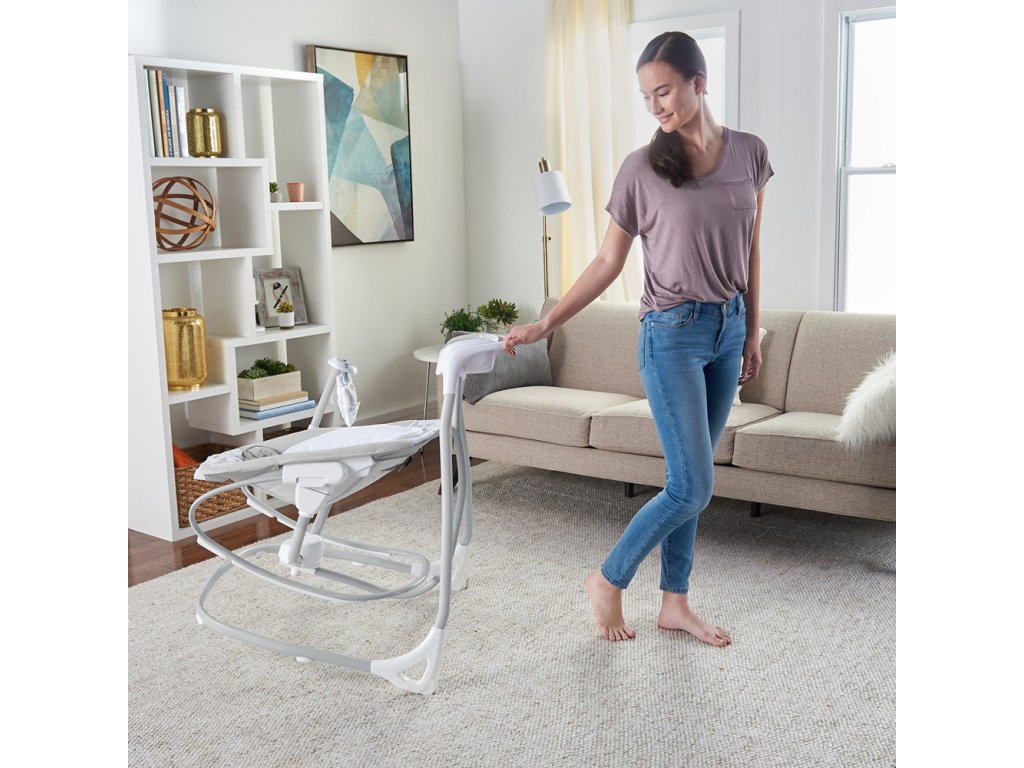 Vďaka modernej technológii je výdrž batérie až 3-krát dlhšia. Pomocou sieťového adaptéra môžete hojdačku pohodlne napojiť do zásuvky a nebudete už vyhľadávať náhradné batérie. Skladací rám je ľahký a vďaka kolieskam sa s ním jednoducho manipuluje. Decentný moderný dizajn, ktorý sa hodí do každého interiéru. Bez ohľadu na to, či ide o hojdačku alebo kolísku, vaše dieťa môže pokojne odpočívať.