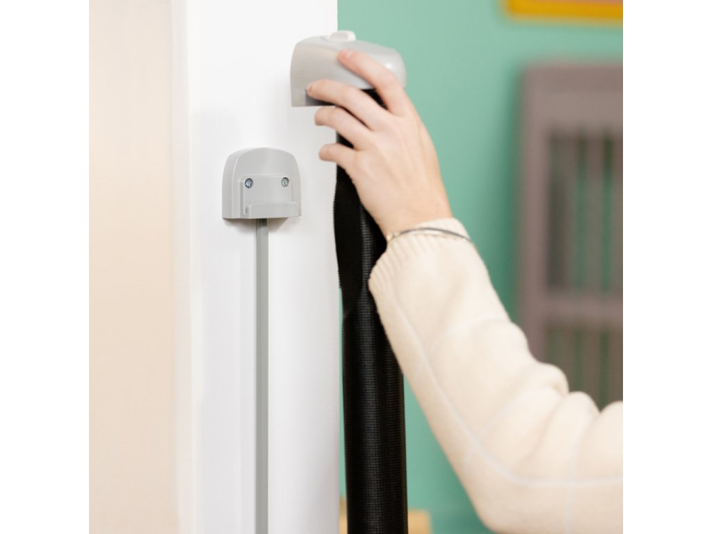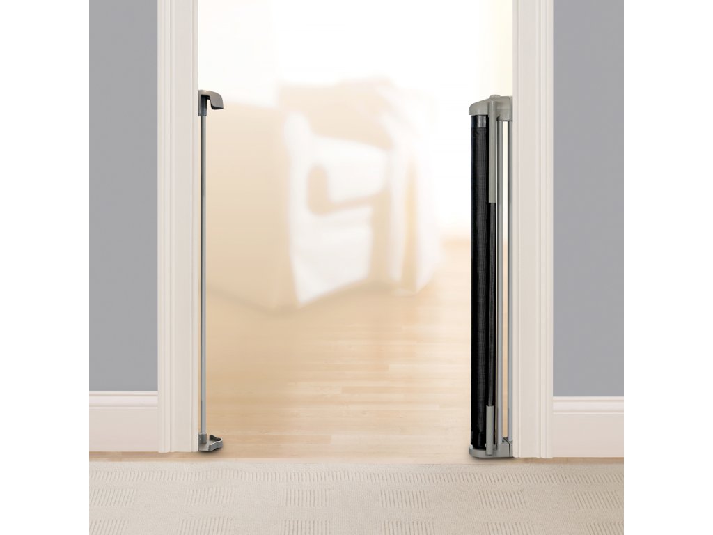 - Rolovací dizajn šetrí priestor – zábrana sa po zložení schová do elegantného držiaka
