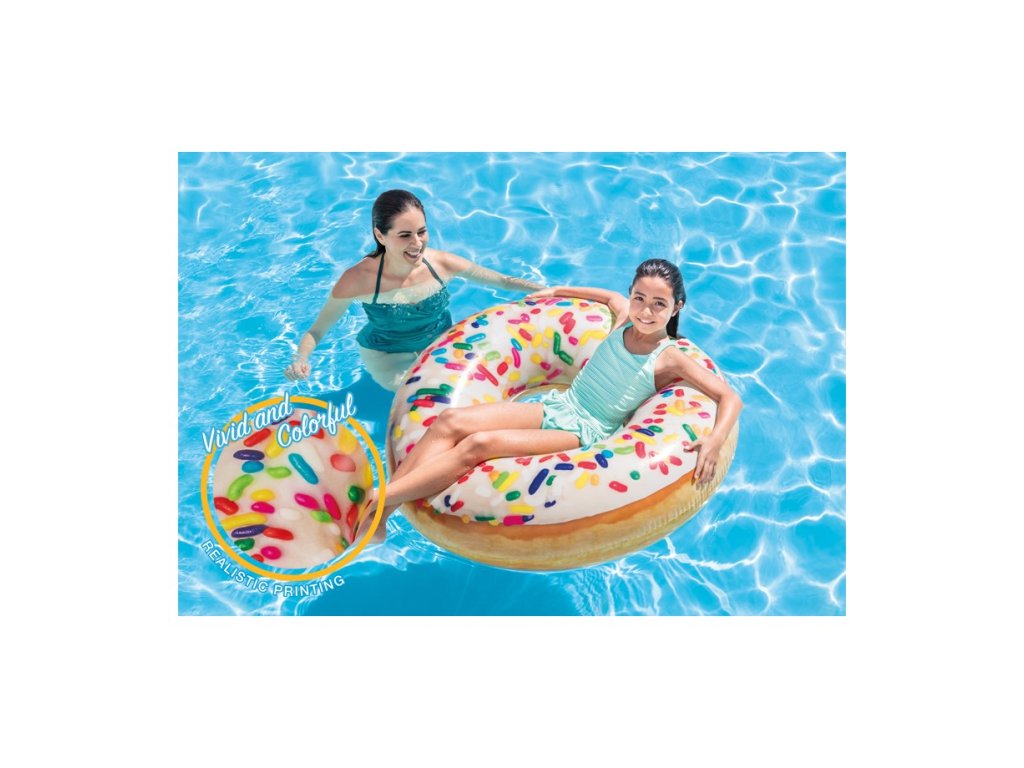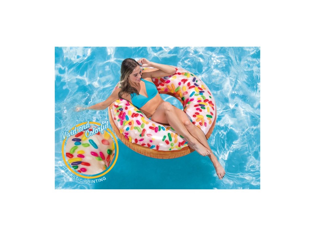 Nafukovací kruh donut s veľkosťou 114 cm. Vyrobené z kvalitného vinylu. Nafukovací kruh s realistickým potlačou šišky donúti. Kruh využijete v bazéne aj na dovolenke pri mori. Krásny kúsok, s ktorým bude kúpanie jedna veľká zábava. Súčasťou balenia je aj sada na opravu.