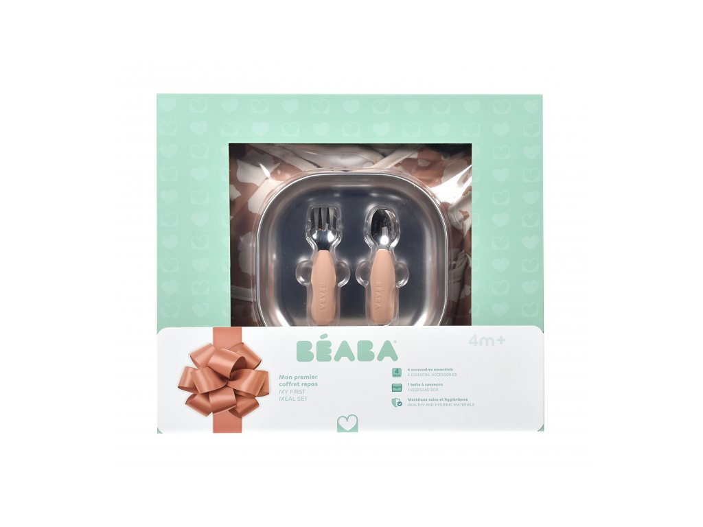 Jedálenskú sadu pre najmenších tvorí nerezový tanier so silikónovou povrchovou vrstvou, ergonomická tréningová lyžička a vidlička a podbradník s odopínacími rukávmi a vreckom na omrvinky. Krásnu krabičku, v ktorej je sada zabalená môžete používať aj ako krabičku na drobnosti.