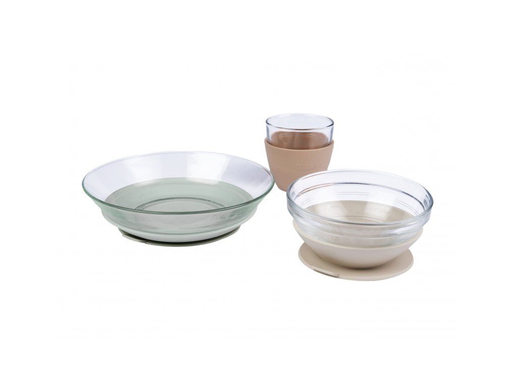 Unikátnu sadu riadu z tvrdeného skla tvorí jedálenská miska, tanierik a pohár ergonomického, zaobleného tvaru s hladkými hranami. Miska a tanier sú doplnené špeciálnymi odnímateľnými podložkami z pružného materiálu s prísavkou, ktorá zaisťuje stabilitu misky či taniera na stole a uľahčuje dieťaťu stolovanie. Návlek na pohárik z rovnakého materiálu uľahčuje dieťaťu uchopenie pohára a znižuje riziko jeho vykĺznutia z ruky.