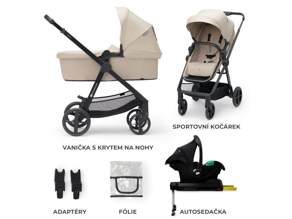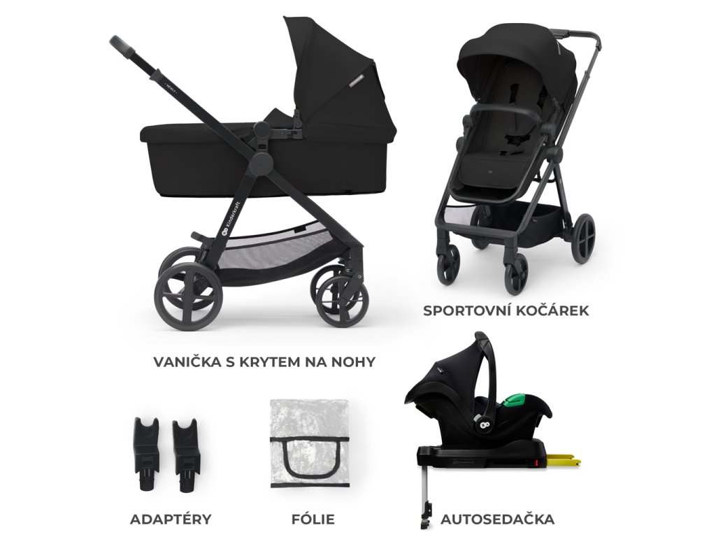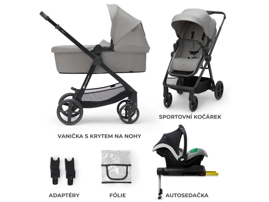 Sada obsahuje: Sedadlo 2 v 1 (vanička a sedadlo), rám, nánožník, pláštenka, autosedačka MINK PRO i-Size (40-75 cm) a adaptéry