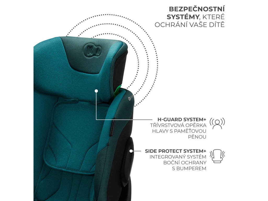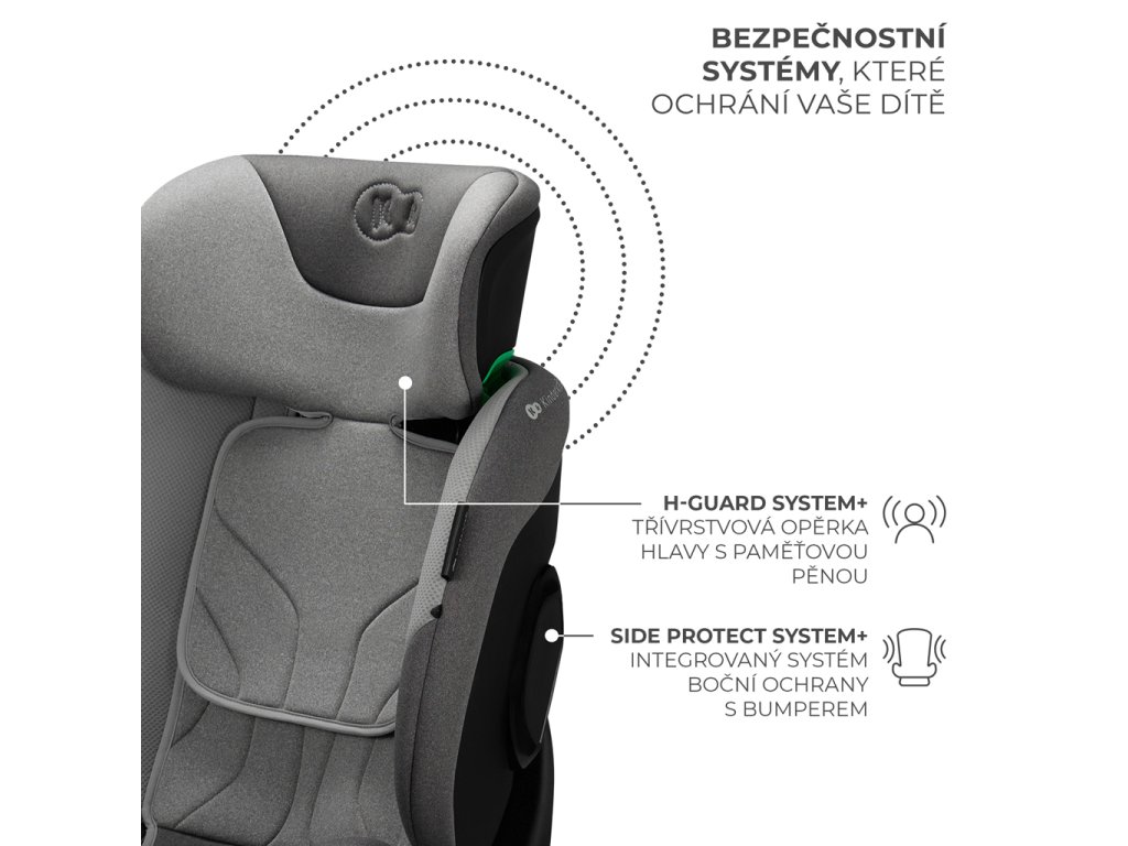 Autosedačka je vybavená 2 systémami, ktoré zabezpečujú najvyššiu úroveň bezpečnosti pri cestovaní. H-GUARD+ je zosilnená 3-vrstvová opierka hlavy s prídavnou penou. Je navrhnutá tak, aby chránila hlavu a oblasť krčnej chrbtice tým, že absorbuje energiu vzniknutú pri náraze a prispôsobuje sa tvaru hlavy dieťaťa pre väčšie pohodlie. Na druhej strane SPS+ je vylepšený systém bočnej ochrany - poťahy boli obohatené o nárazníky, ktoré pôsobia ako deformačná zóna v aute a ďalej spevňujú konštrukciu sedačky v kľúčových bodoch. Pohlcujú prvú a najsilnejšiu silu nárazu, rozptyľujú ju a zabraňujú jej preniknutiu k telu dieťaťa.