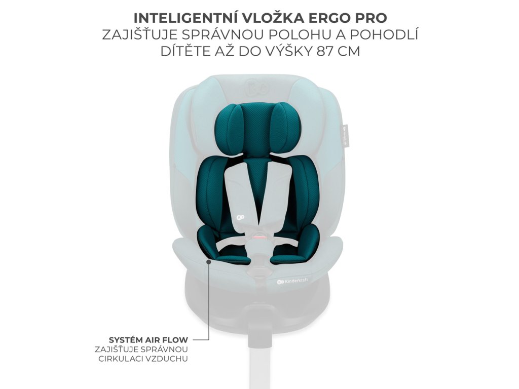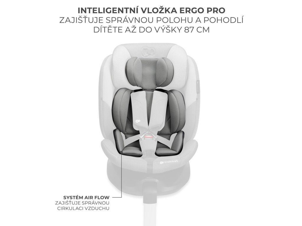 Autosedačku má vložku ERGO PAD PRO s rozšíreným rozsahom použitia (do výšky 87 cm). Podporuje zaujatie správnej anatomickej polohy tela dieťaťa počas jazdy. Vložka má systém AIR FLOW, ktorý zabezpečuje dostatočnú cirkuláciu vzduchu počas horúceho počasia.