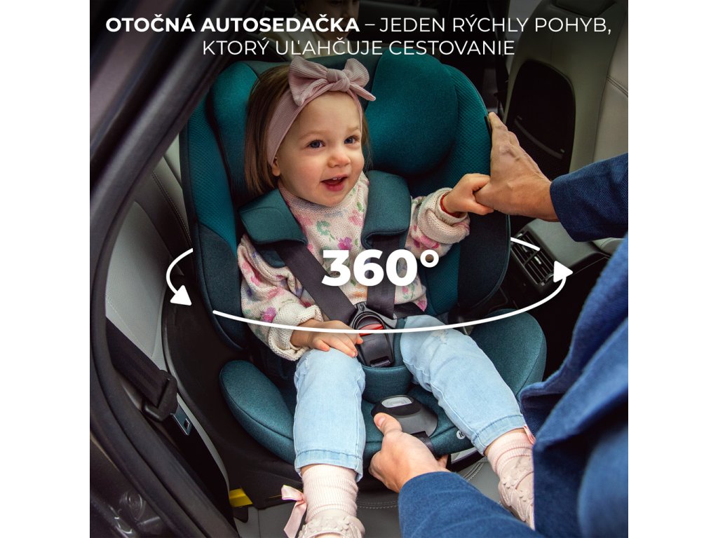 Systém EASY SPIN 360° umožňuje pohodlne otočiť autosedačku okolo svojej osi. Nielenže umožňuje pohodlnejšie vyberanie dieťaťa z auta (stačí polohovať autosedačku v smere dverí) alebo jeho pripútanie pomocou 5-bodových bezpečnostných pásov, ale umožňuje aj rýchlu zmenu z RWF na FWF bez nutnosti demontáže celej autosedačky.