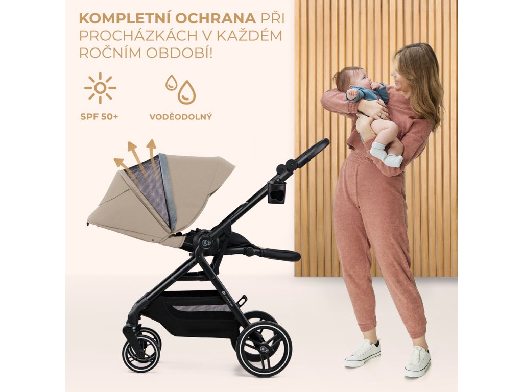 Strieška kočíka je veľká a nepremokavá, s filtrom UPF50+. Má prídavný vetrací panel a okienko pre kontakt s dieťaťom, cez ktoré môžete sledovať, čo vaše dieťa robí.