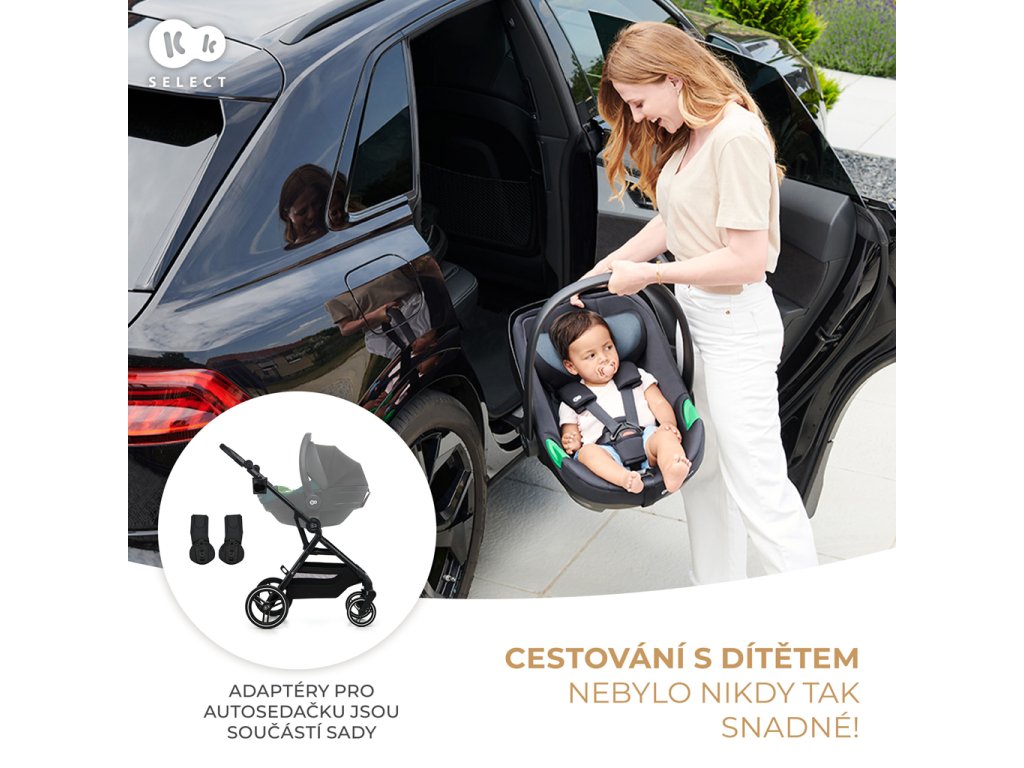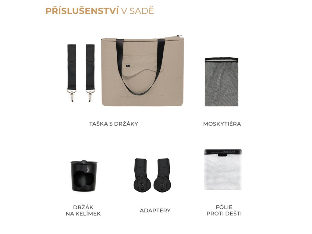 Kočík sa dodáva aj s celým radom praktického príslušenstva, ako je sieťka proti hmyzu, pláštenka proti dažďu, držiak na pohár, taška na rukoväť pre rodiča a adaptéry na detskú autosedačku. Adaptéry vám umožnia vytvoriť TRAVEL SYSTEM, ak už máte detskú autosedačku. A to všetko v jednom kočíku!
