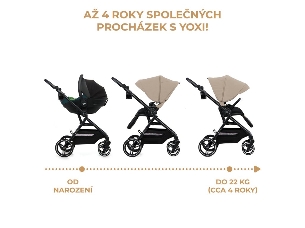 Športový kočík YOXI je určený pre deti od narodenia do približne 4 rokov. Počas prechádzok vás bude sprevádzať pohodlný kočík, ktorý sa dá pripnúť smerom dopredu alebo dozadu k rodičovi. YOXI umožňuje vytvoriť TRAVEL SYSTEM vďaka priloženým adaptérom.