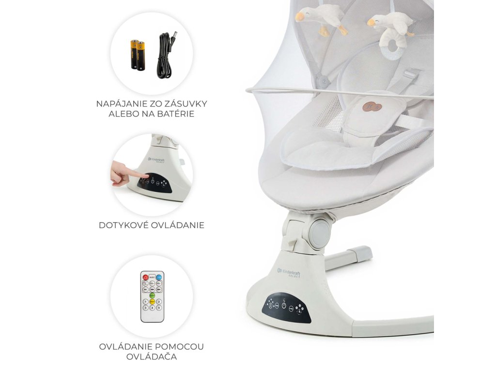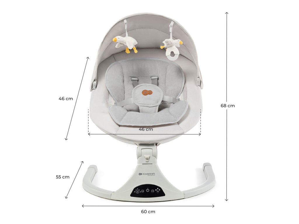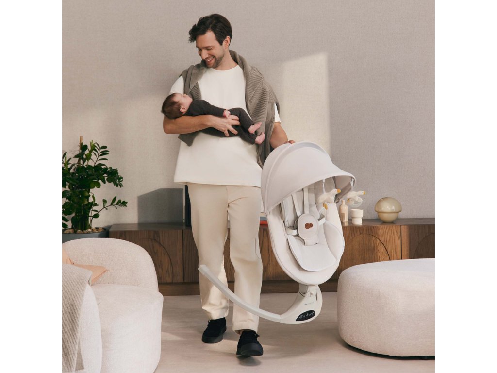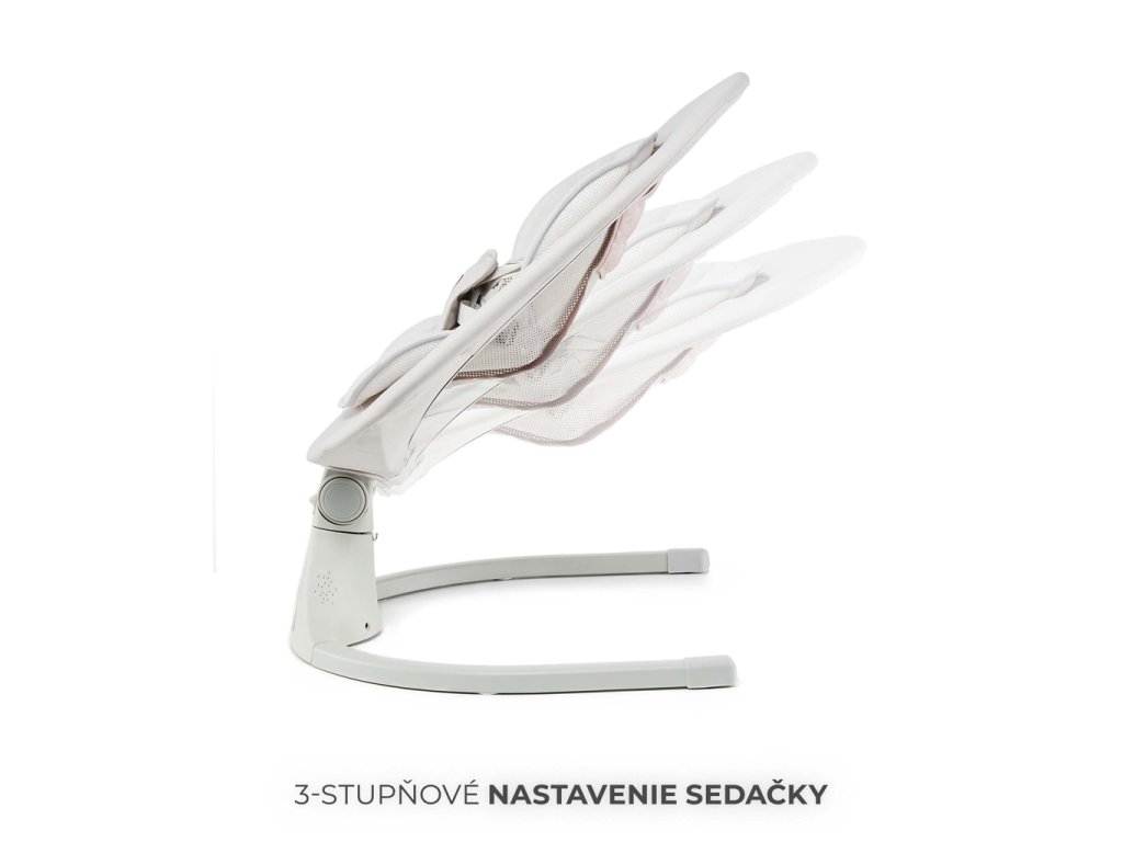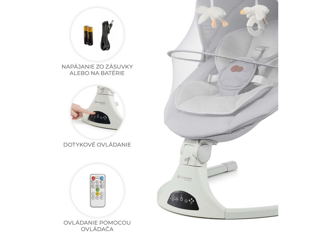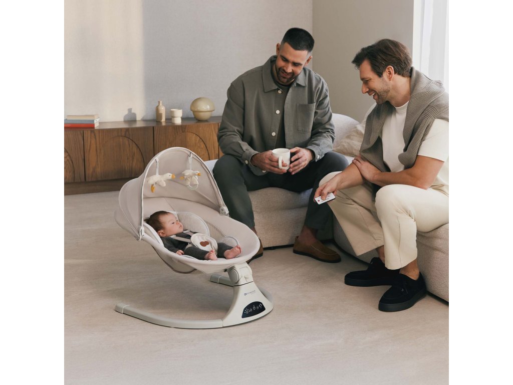 Vďaka intuitívnemu dotykovému panelu a diaľkovému ovládaniu môžu rodičia ovládať hojdanie bez prerušenia svojich aktivít a prispôsobiť ho aktuálnym potrebám dieťatka. Ľahká konštrukcia hojdacieho kresla umožňuje ľahké prenášanie, zatiaľ čo ergonomická sedacia časť s extra mäkkou vyberateľnou vložkou a 3-polohovým nastavením sedačky zaručuje nielen správnu polohu pre vaše dieťa, ale aj jeho pohodlie.