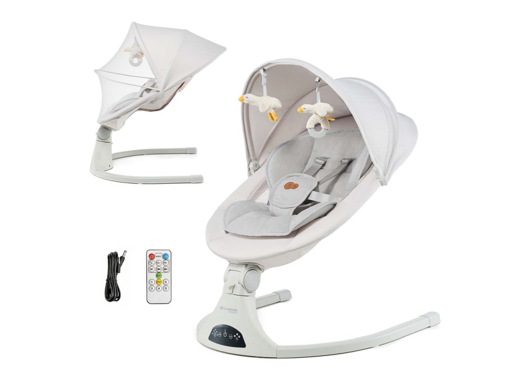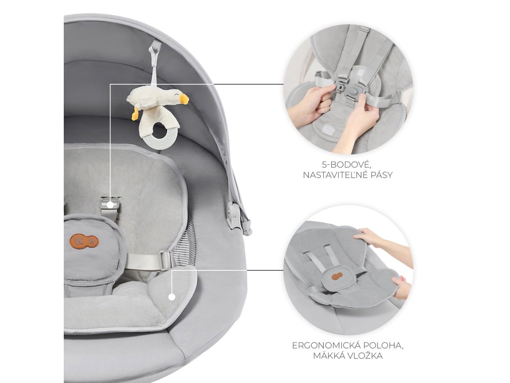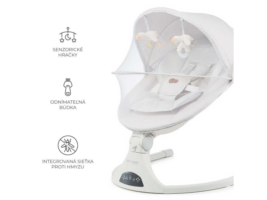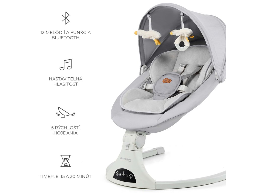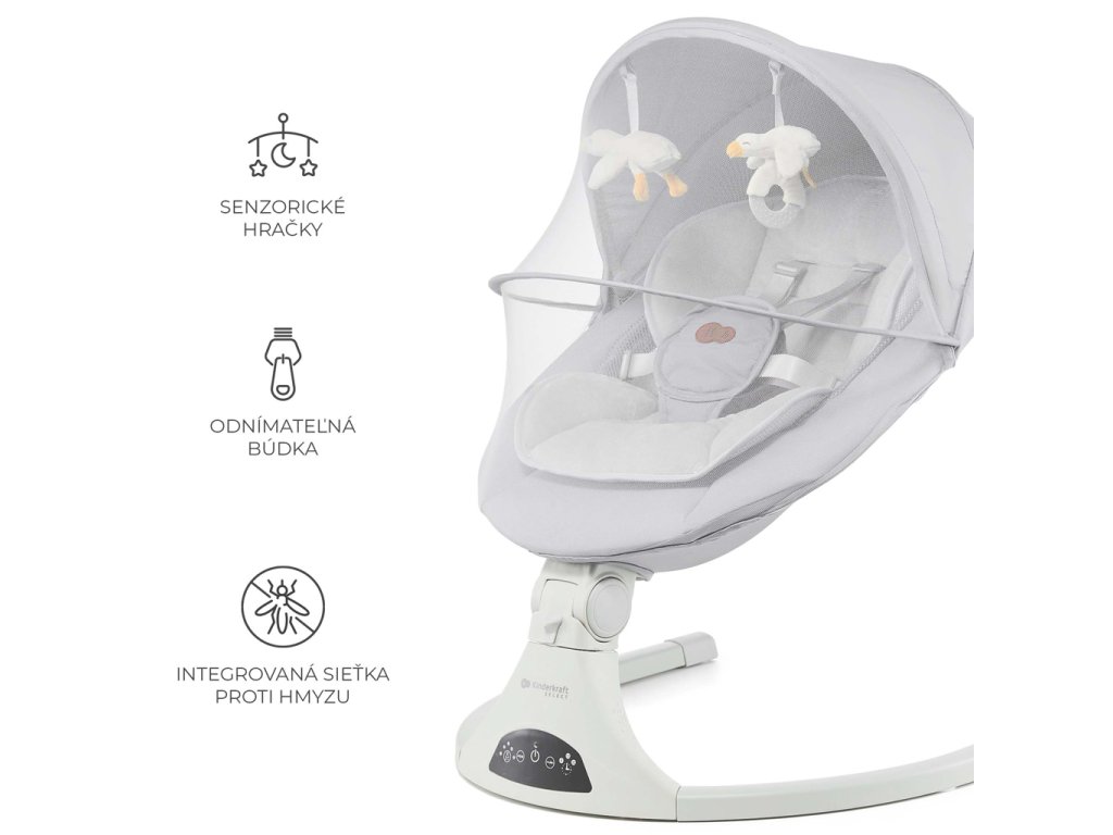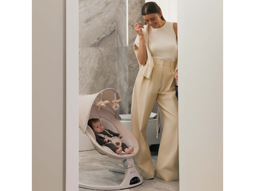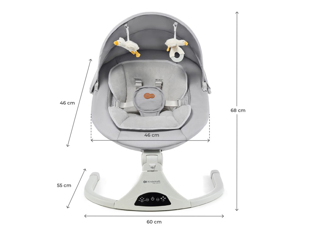 Vďaka intuitívnemu dotykovému panelu a diaľkovému ovládaniu môžu rodičia ovládať hojdanie bez prerušenia svojich aktivít a prispôsobiť ho aktuálnym potrebám dieťatka. Ľahká konštrukcia hojdacieho kresla umožňuje ľahké prenášanie, zatiaľ čo ergonomická sedacia časť s extra mäkkou vyberateľnou vložkou a 3-polohovým nastavením sedačky zaručuje nielen správnu polohu pre vaše dieťa, ale aj jeho pohodlie.