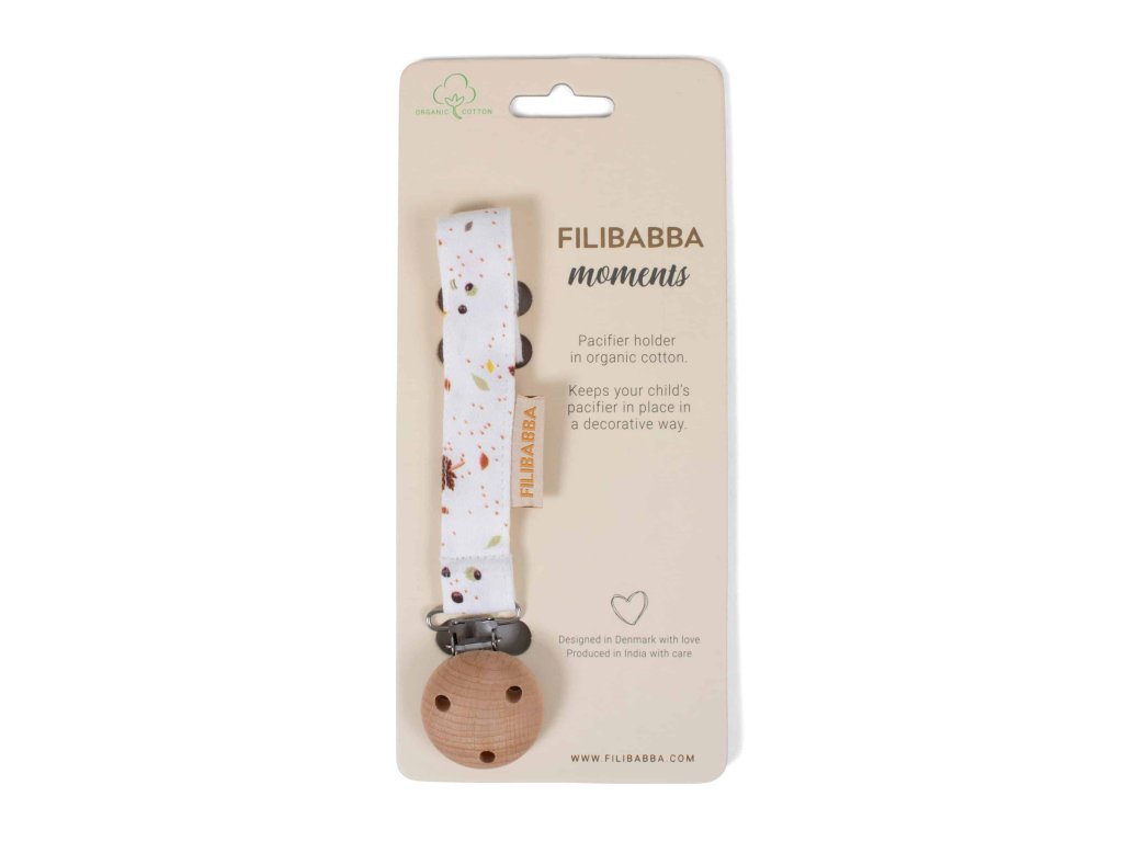 Ľahučký klip na cumlík z organickej bavlny, s detailmi v trendy jesenných farbách, dreveným gombíkom, kovovou sponou a suchým zipsom na prichytenie cumlíku.