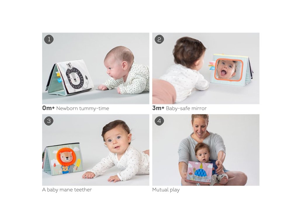 - 0-3 mesiace: stránky s bezpečným zrkadielkom a vysoko kontrastnými jednoduchými obrázkami, ktoré podnecujú rozvoj zmyslov a emočnej inteligencie dieťaťa