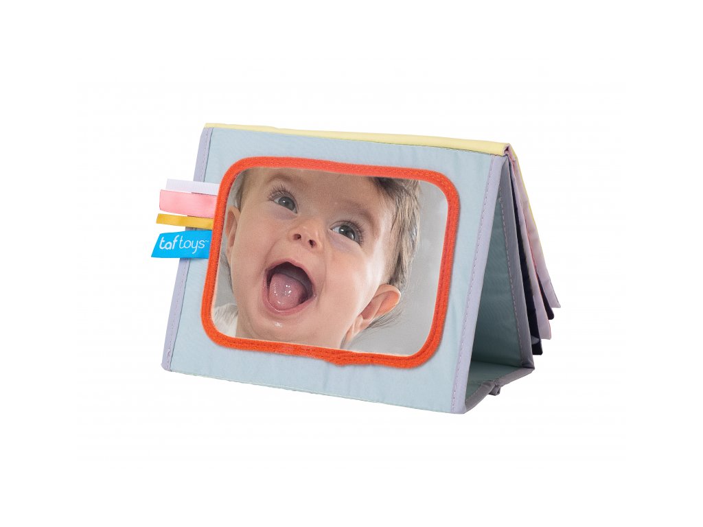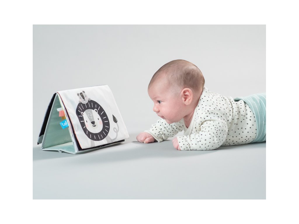 Textilná knižka s otáčajúcimi šuštiacimi stranami v tvare stolného kalendára ponúka množstvo neodolateľných obrázkov s rôznorodými textúrami, bezpečným zrkadielkom, hryzátkom apod. Ideálne pre postavenie pred dieťa pri hre na brušku.