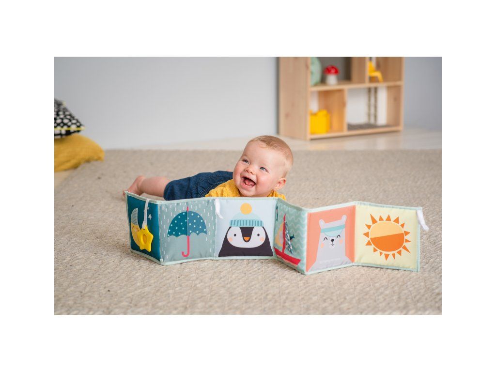 - Od 3 mesiacov: strana s farebnými obrázkami a rôznorodými textúrami na skúmanie, ktoré podporujú rozvoj zmyslov a jemnej motoriky dieťaťa.