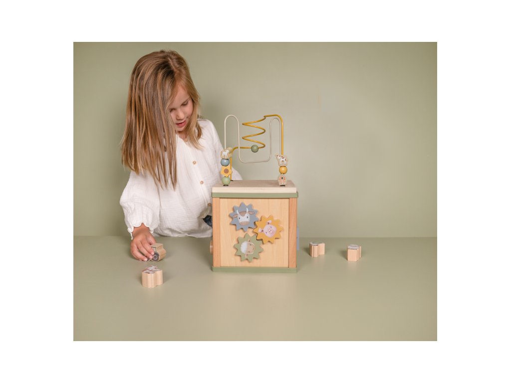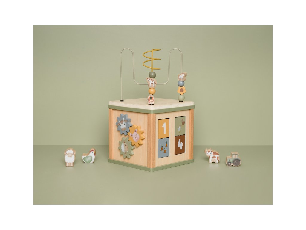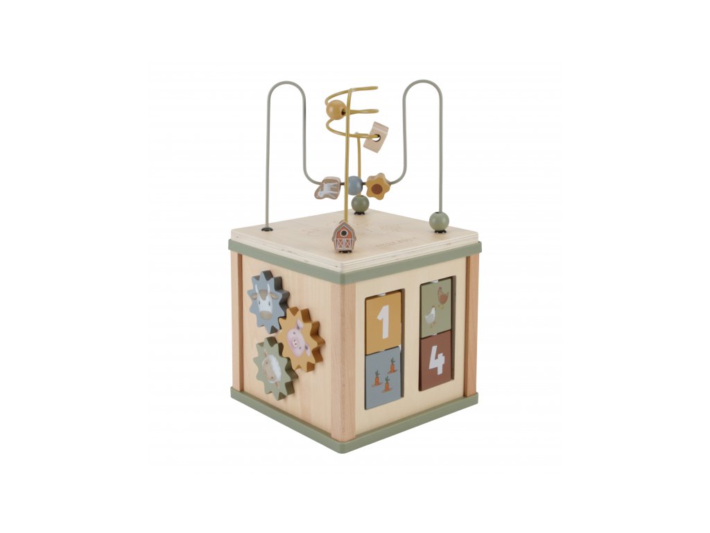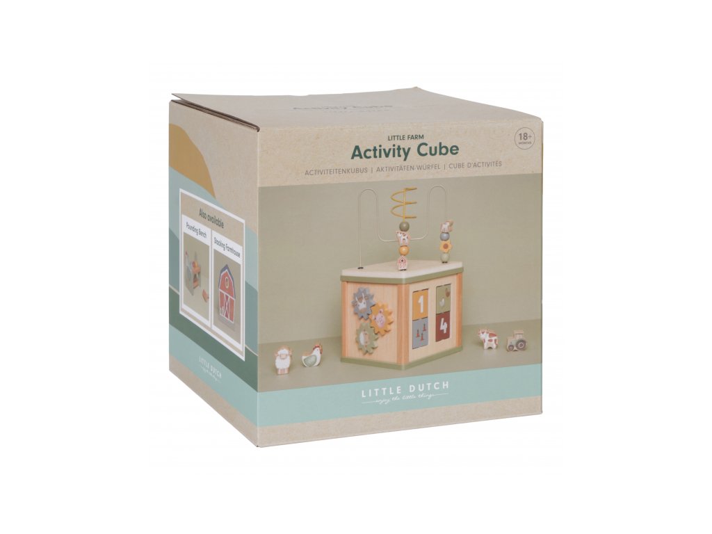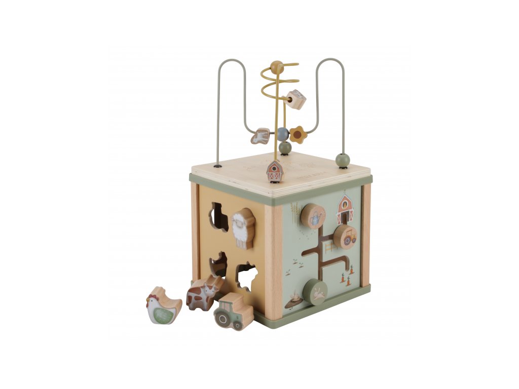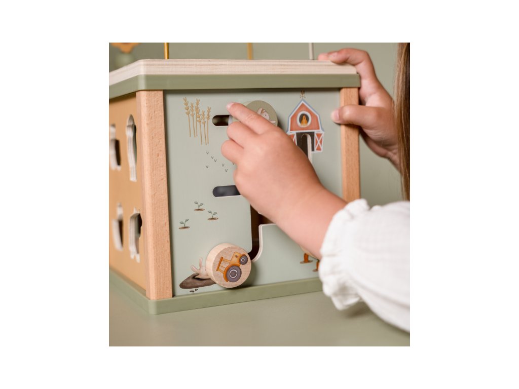Krásna drevená kocka s aktivitami a motívmi zo života na farme vzbudzuje u detí zvedavosť a poskytuje im množstvo zábavy. Jednotlivé strany kocky obsahujú ponúkajú rôznorodé aktivity - napr. triedenie tvarov, rotujúce prevody, hádanky či špirály s posuvnými korálkami.